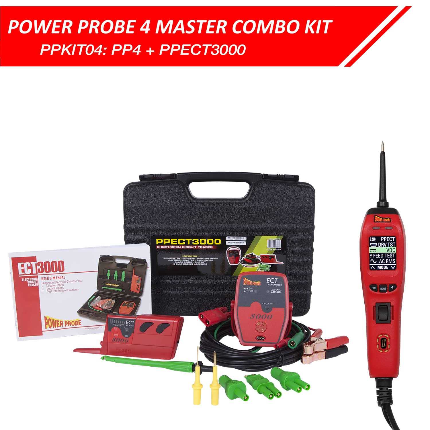 The Power Probe 4 Master Combo Kit combines the Power Probe 4, PPECT3000 and various accessories to provide the ultimate combination of diagnostic and circuit-testing capabilities. The Power Probe 4 provides simplified testing of Motors, Lights, Relays, and Sensors, and even Fuel Injectors. Also, like all Power Probe circuit-testers, it supplies Power and Ground for functional component testing on or off the vehicle. The PPECT3000 will help you trace short and open circuits quickly and accurately.