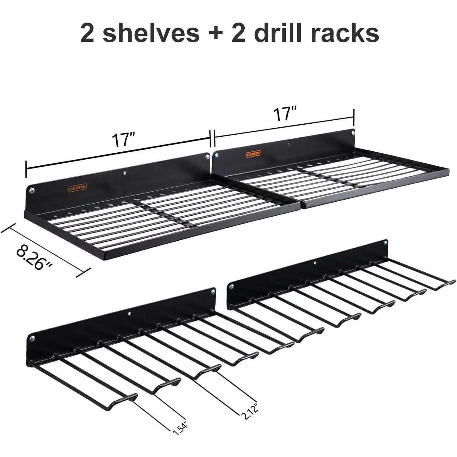 Garage Space Saver The tool organizer set include 2 shelves for battery charging station and 2 part which include 4 slots for drill,these items always made your garage disorder because you always have no idea to how to store them,righti guess you don’t like to put them back to the tools box and store them completely because you always believe you will use them soon confused our designer also,so it appeared! Free Assemble &Easy Install The storage shelf and wall mount drill holder is no need assemble,you can install them directly with the provided screws,the instruction is together to guide you how to install the tool rack on different wall.