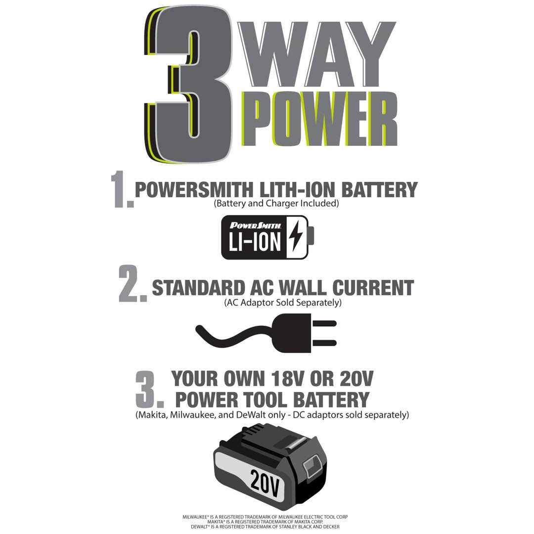 The New PowerSmith Voyager 8000 Lumen Collapsible LED Work Light with 3-Way Power options is the perfect solution for your commercial, industrial, job-site, and home project lighting needs. Whether you are Painting, Hanging drywall, Prepping the job site, Setting up a photo shoot, Lighting up a factory work station, Playing basketball in the driveway, Hosting a backyard barbeque, Playing volleyball at the beach, or Lighting up a campsite, the 4 adjustable light heads and telescoping tripod will project the light where it is needed. Your Voyager comes with a 12V 8.8Ah Li-Ion Battery that will power the light for 1-1/2 hours at the full 8000 lumens, and up to 6 hours at 2000 lumens on a single charge! You can also purchase an optional AC adapter and power your Voyager non-stop from any 120V electrical outlet or extension cord. And you can purchase an optional DC adapter and power your Voyager with a Makita, DeWalt, or Milwaukee Power Tool Battery! The Voyager 8000 Integrated Aluminum Tripod Telescopes the light up to 79′′ Tall and also folds down into a super-compact tube for transportation and storage. At 4-1/2′′ by 33′′ and weighing only 9.5 lbs., the collapsed Voyager can be moved and stored easily -place it in the cab of your truck instead of in the back, where it can get damaged or stolen. Model PVLR8000A Voyager comes with battery, charger, carrying bag, shoulder strap, foot spikes, and remote to control the light modes and power on/off. No Tools or Assembly required.