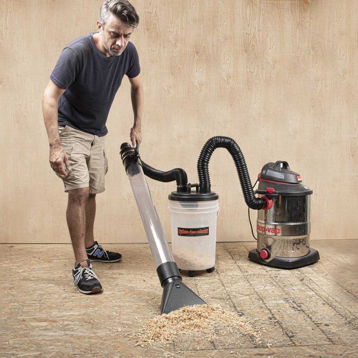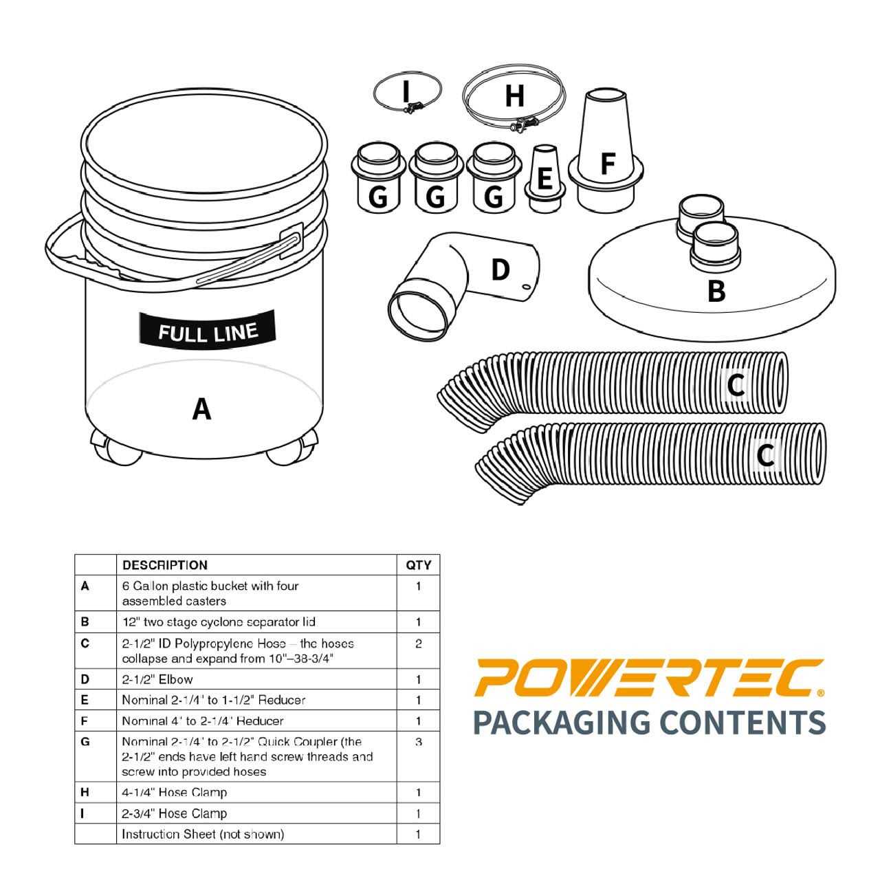 This supplementary set offers an easy-to-use, lightweight and convenient assortment of dust collection components intended to prevent avoidable damage to your dust collector, the separator helps eliminate wear and tear by capturing and separating large wood chips, shavings and other harsh debris associated with dust collection and woodworking, it also cuts down on your container or dust bag from filling up so rapidly, the separator works by allowing heavy wood chips to fall directly to the bottom of the container, while the lighter dust particles get pulled in the out feed port and into your dust collector. Compatible and versatile, the POWERTEC cyclone dust collector separator kit comes with a host of clamps, hoses and fittings made for dust collection and tool dust ports. Kit includes: 12 in. 2-stage cyclone separator. 6 Gal. container with 4-casters. 2x flex hoses (2-1/2 in. I.D.), 2-1/2 in. elbow. 2-1/4 in. to 1-1/2 in. reducer. 4 in. to 2-1/4 in. reducer. 3x nominal 2-1/4 in. to 2-1/2 in. quick coupler: 4-1/4 in. hose clamp. 2-3/4 in. hose clamp.