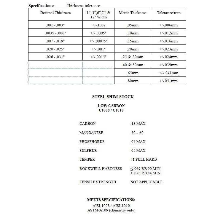 Precision Brand Steel Shim Stocks are made from full hard, cold rolled, low carbon 1008-1010 steel for long lasting durability. Material can be punched or sheared with minimum burring and distortion. Shim is clearly marked with material type, thickness and lot number for full traceability. Rigorous quality control standards assure high accuracy and tight tolerance. Length is 100 inches and width is 6 inches. Thickness is 0.002″.