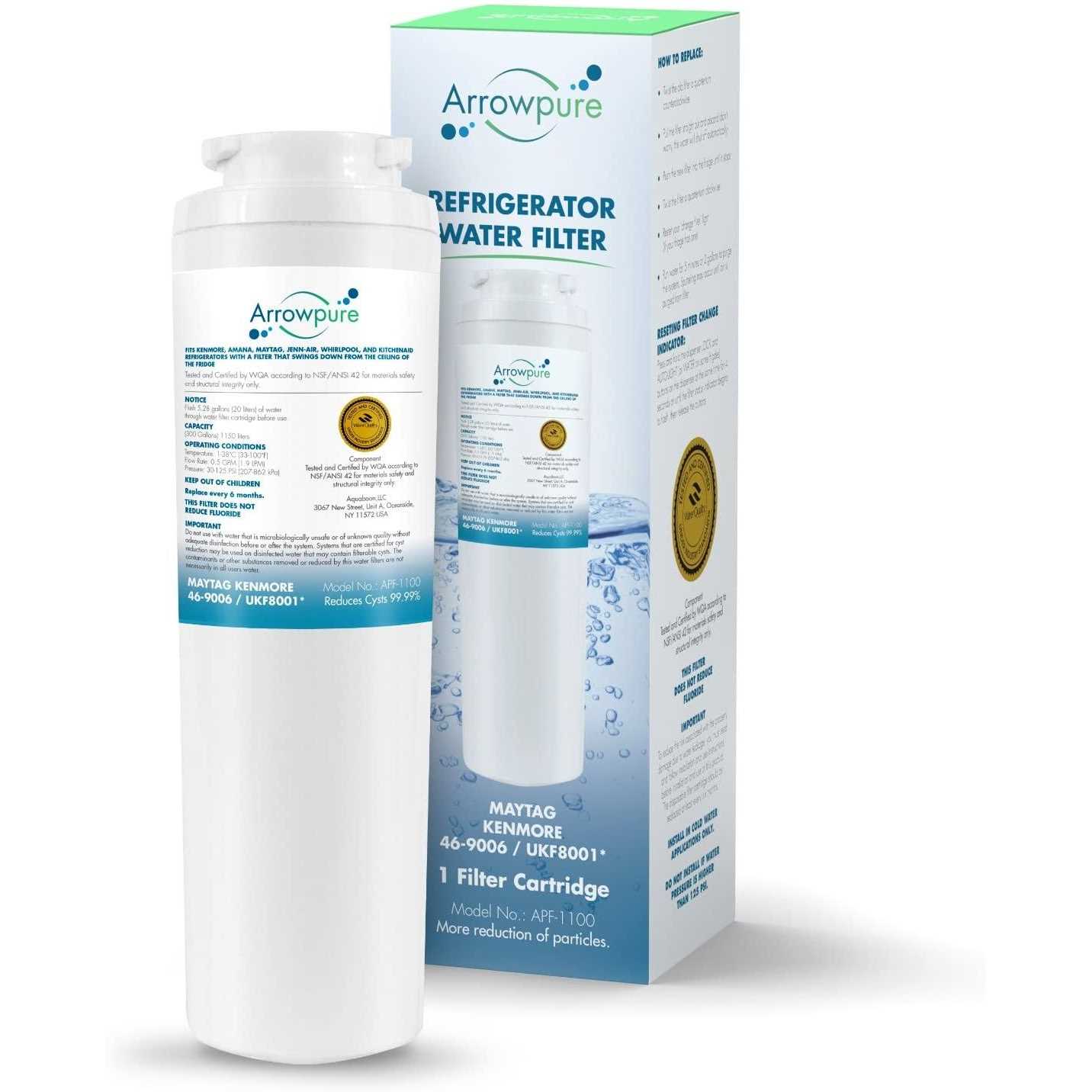 The APF-1100 water filter by Arrowpure. This high-quality water filter replacement provides you with consistently clean, healthy and delicious water. Install in 60 seconds and eliminate any chlorine, bacteria, chemicals and dangerous elements that might be found in your water source. Simple as that. No leaks, no complications, just a steady flow of healthy and tasty water! Get rids from cysts, chlorine & harmful chemicals Keeps the healthy minerals & improves taste Compatible with most Kenmore, Viking, Maytag refrigerators Installs in seconds, perfect fit, no leaks WQA certification according to NSF 42, NSF 372 Compatible with the following refrigerator models: 4396395, 4396395P, 4396395T, 46-9005-750, 46-9006, 46-9006-750, 46-9992, 469006, 469006-750, 67003523, 67003523-750, 67003591, 67003727, 67006470, 8001, 8001P, 8171249, 9006, 9006P, 9992, AFF3, AP4343647, EFF-6007A, EFF6007A, FILTER4 WQA certification according to NSF 42* means reducing aesthetic impurities such as chlorine and taste/odor from your water. Enjoy tastier and healthier water with a refreshing taste. WQA certification according to NSF 372* means that the Arrowpure water filter is made of lead-free material giving you a completely safe water. Enjoy advanced filtration with coconut activated carbon that is super-absorbent and completely natural. Get rid of the harmful chlorine, cysts, lead, and other similar harmful chemicals, and keep the healthy minerals. Our premium fridge filters come with easy to understand instructions so you can have yours ready in under a minute. You’ll love that installation takes no tools, no time and no effort! Drink healthier and tastier water with your family every day. Our ultimate goal is to enhance your health and overall wellbeing with perfect filtration. For best results change our replacement filters every 6 months. Compatible filters:Maytag OWF50-NI300, WF50-NI300, WF50-WI500, WF50-KNI300, OWF50-WI500, UKF-8001, 8001P, WF50-KWI500, 67003523, 12589208, 12589206, OWF51, 101414-B, UKF8001AXXP, 12589210, Kenmore 46-9006, 46-9005, 469006, 469006-750, 46-9992, EveryDrop by Whirlpool EDR4RXD3, EDR4RXD2B, Whirlpool/KitchenAid 8171032, 8171249, W10181835. Compatible refrigerator models:Maytag MFI2269VEM1, MFI2568AEB, MFI2569VEM4, MFD2561HES, MSD2641KEB, MZD2665HES, MSD2651HES, MFI2269VEA1, MSD2650KEU, MFI2569VEB2, MFI2568AEW, MFD2560HEW, MSD2651KES, MFD2560HEB, MFX2571XEM0, MFI2269VEM6, Whirlpool GI6FDRXXY00, GI5SVAXVL01, GI0FSAXVY011, GI5FSAXVY01, GI6SDRXXY01, GI5FSAXVY00, GX5FHTXVB00, GX5FHTXVQ00, GX5FHTXVA00, GX5FHTXVY00, GI6SDRXXY00, GI6SDRXXQ00, GI6FDRXXB00, GI6FDRXXQ00, GI6SDRXXQ01, Kenmore 59672013012, 59673502201, 59676609600, 59676602600, 59672003016, 59676603601, 59675523400, 59676603600, 59672282200, 59676592600, 59675533400, 59650013100, 59652673201, 59673509200, KitchenAid KFCP22EXMP5, KFIS20XVMS2, KBFS25ETSS00, KBFS25EWMS1, KBFS20ETSS00, KFIS20XVMS, KBFS25EVMS00, KFIS25XVMS9, KFIS27CXMS1, KFIS20XVMS1, KFIS25XVBL00, KFIS25XVMS00, KFIS25XVWH00, Amana AFI2538AES13, AFI2538AES3, AFI2538AEQ3, AFI2538AEQ13, ARB2557CC, ABD2533DEW, AFD2535DEW, AFD2535FES3, ABD2233DEW14, AFI2538AES4, ABD2233DEB14, Jenn-Air JFC2089HPR10, JFC2089WEM1, JFC2070KRB11, JFI2589AEP10, JFI2589AES10, JBL2286KES12, JBR2286KES12, JFC2089HTW12, JBD2286KEW11, JFC2070KRW11, JBD2286KEB11, JFC2089HTB12, JFC2290VEP10, Dacor EF36RNDF, Viking DDBF, DDSF036, VCFF, YOUR WATER PURIFIED HEALTHY & TASTY. Effectively removes 99% of the chemicals, cysts, asbestos, particulates, lead, mercurchlorine, and unhealthy contaminants from your refrigerator water. Easy & fast way to clean water.