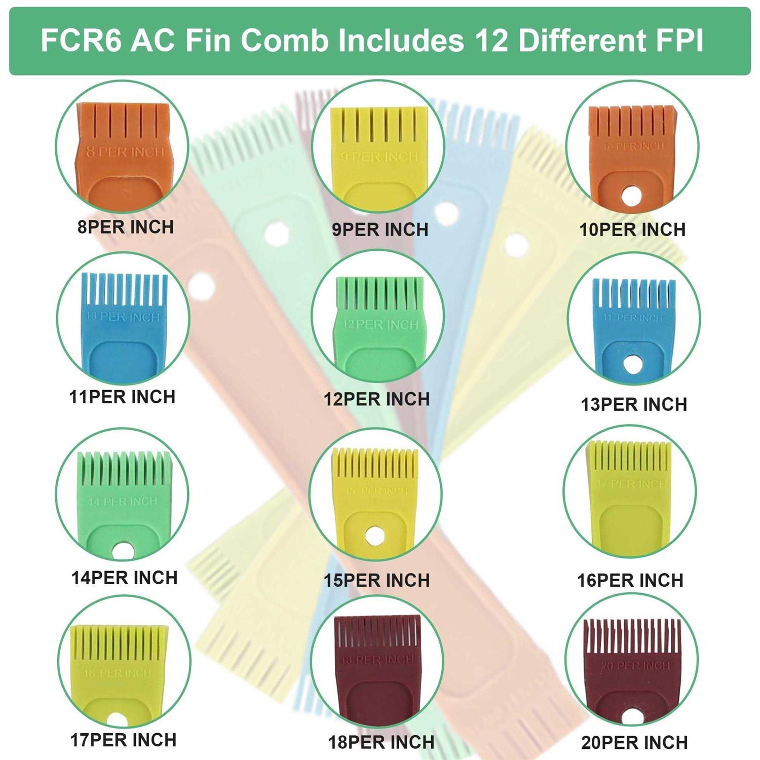 Easily maintain the coils of your air conditioning system with this fin comb set. This product includes six combs that are attached to a flexible, stainless steel ring. The combs are made of colored plastic, and each has fins of a different size. There are 8 to 20 fins per inch, allowing you to choose the right size for your coils. These combs help to straighten the evaporator and condenser coils, improving the system’s energy efficiency.
