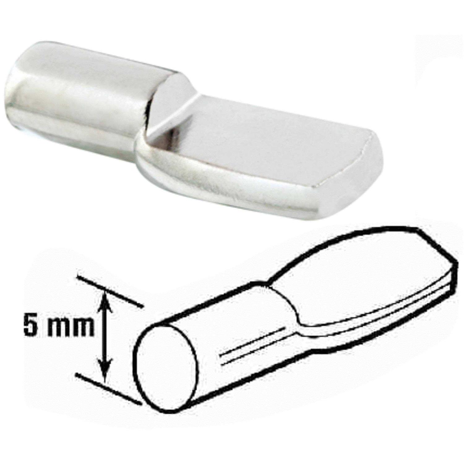 Prime-Line These shelf support pegs are constructed from heavy-duty steel and come plated in a bright nickel finish. They are designed to fit into 5 mm. (3/16 in.) diameter holes, making them perfect for most metrically sized imported cabinets and bookshelves. Each peg has a 25 lb. maximum safe load. Can be used for many heavier-duty applications such as in furniture with glass shelves. Shelf support pegs are easy to install and are used by a variety of manufacturers.