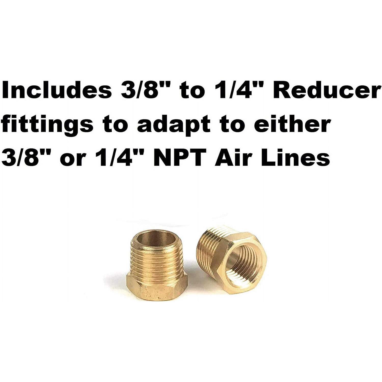 The unit has 3/8 in. inlet and outlet ports, and also comes with 3/8 in. to 1/4 in. reducer fittings to adapt to 1/4 in. air lines. The Regulator will handle up to 200 psi inlet pressure and will regulate to a maximum outlet pressure of 160 psi Outlet pressure.