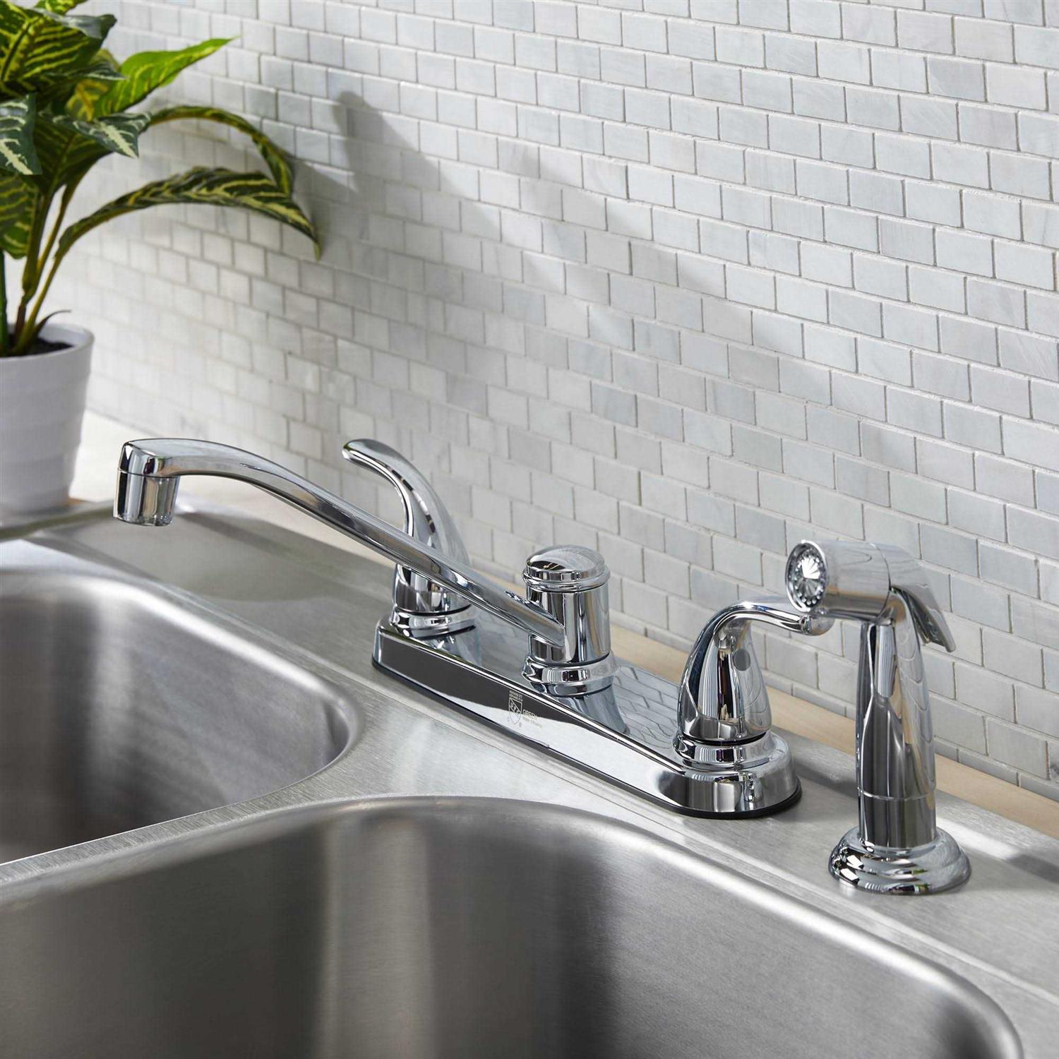 If the basics are what you need, this two handle 8-in centerset faucet with coordinating side sprayer, will meet your needs. This kitchen faucet meets water flow guidelines without sacrificing performance. This faucet is finished in crisp chrome, providing a polished surface. A stress-free installation guide, makes changing out your faucet a breeze.