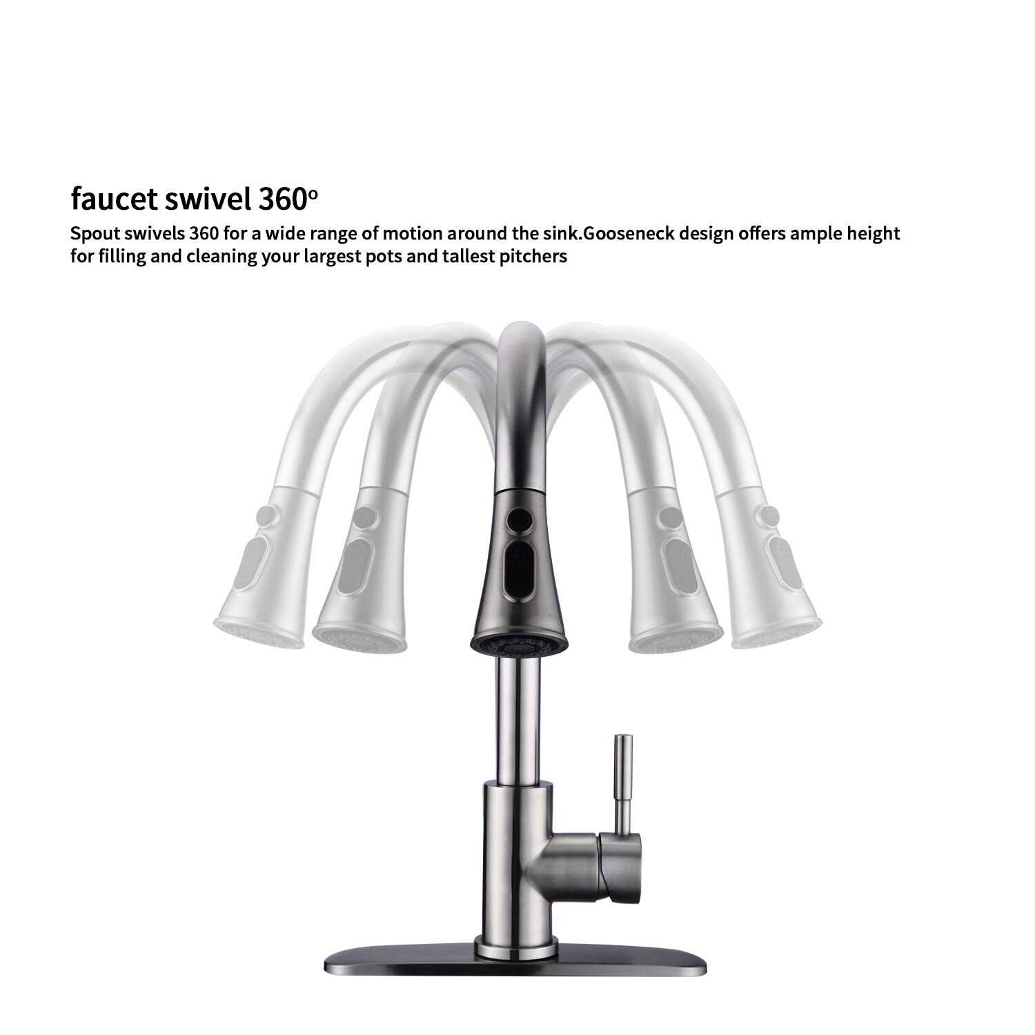 Add modern convenience to your kitchen with this sleek and stylish kitchen faucet. The faucet is crafted from premium SUS 304 stainless steel for a durable, easy to clean design with an arched spout that features a smooth-retract nylon sprayer hose. The single handle controls both temperature and flow volume, and the360 degree swivel provides for a full range of washing. Features: Made from Premium SUS 304 stainless steel Durable and easy to clean Flow Rate 1.8 GPM Fits underneath almost any kitchen cabinet Smooth-retract nylon sprayer hose Extended 20-inch range allows you to easily reach all areas of sink 3-way spray setting, stream, spray, pause Stream for filling water, spray for rinsing, pause for avoiding splashing Easy to operate, single handle control water temperature and flow volume High arc 360 degree swivel spout for full range washing Sprayer head always retracts back to spout Compatible with standard 1 or 3 hole kitchen sinks. Pull down hose and water line hose preinstalled in kitchen faucet Finish DIY installation in less than 30 minutes Dimensions: Faucet :15.2 inches high x 2.16 inches wide x 8.66 inches deep Spout Reach: 8.66 inches Spout Height: 6.89 inches Hose Length: 20 inches