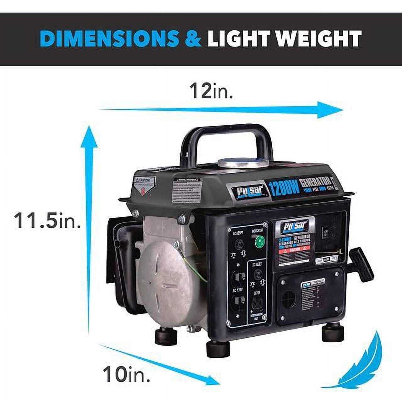 Generators by Pulsar. Details:This Pulsar gas 2 Stroke peak 1200W generator has a maximum output of 1200W/60Hz & rated output of 900W/60Hz. It has a 69cc single cylinder 2 HP air cooled Engine. It runs 8. 5 hours at half load & includes a recoil start & 12V DC output.