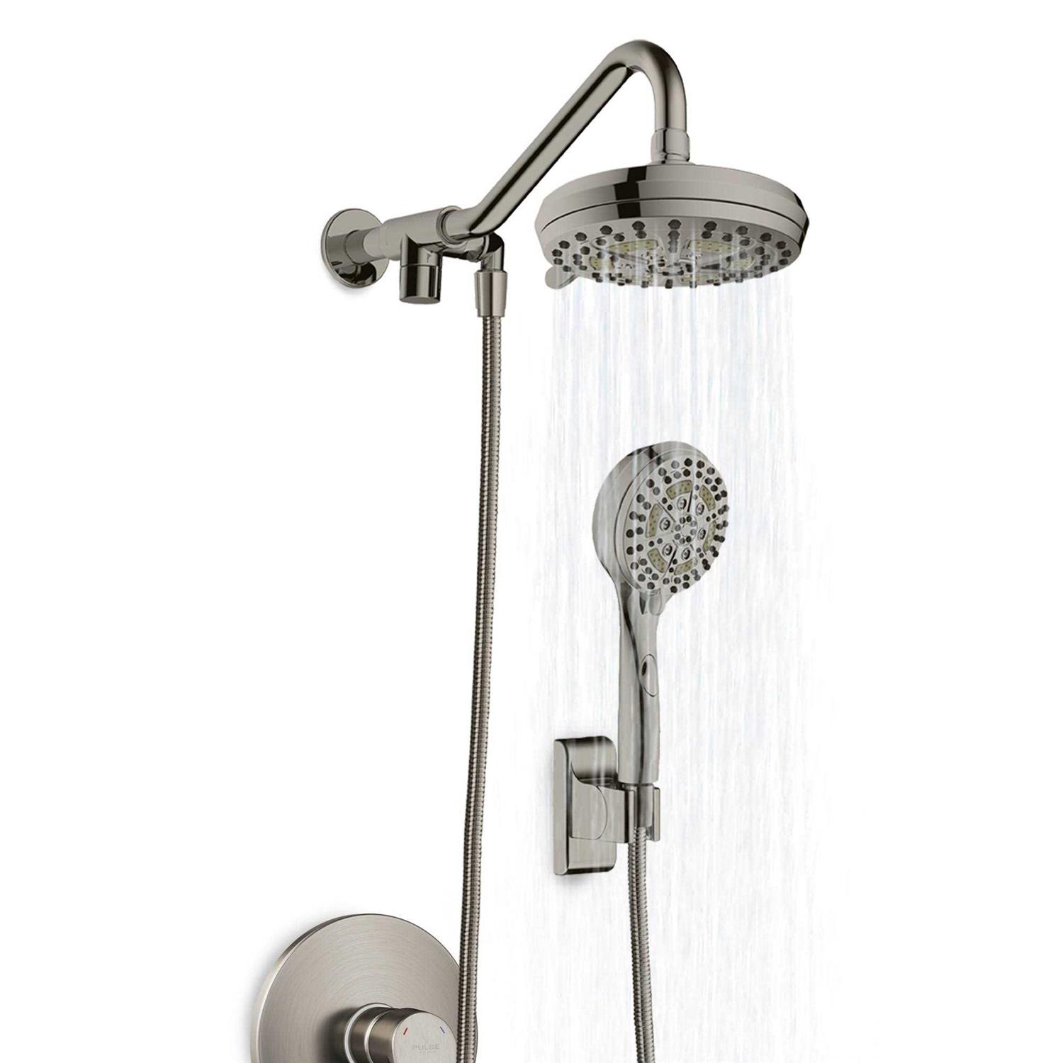 The 5-function shower head and 6-function hand shower can be used simultaneously or separately, creating more than 30 possible shower combinations. The convenient trickle button allows you to pause your hand shower spray when needed. The hand shower mount can be mounted with the included drill-less glue at your desired location.