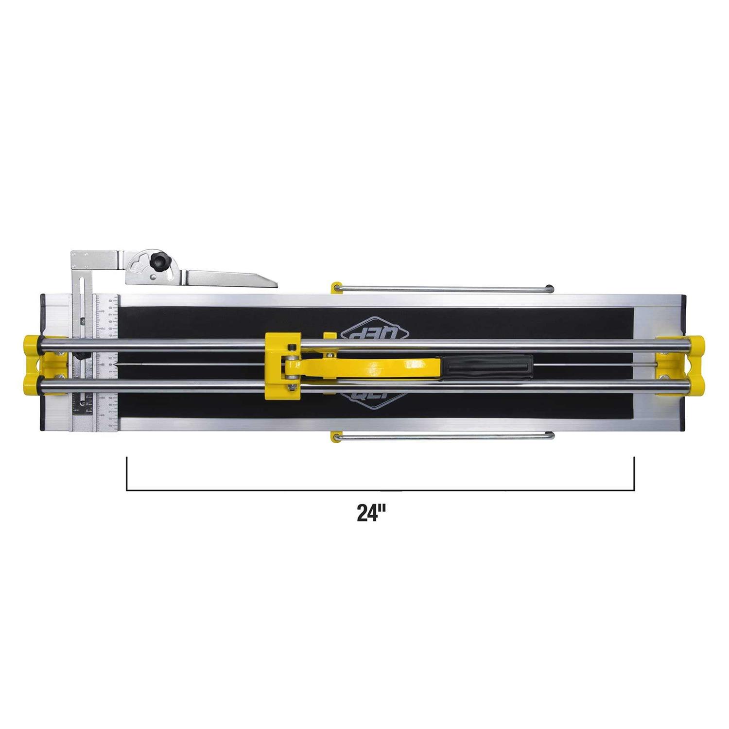 The QEP model 10630 24-Inch (630mm) Manual Tile Cutter is designed for both ceramic and porcelain tile. The simple score and snap process is a quick way to rip and diagonally cut tiles. The dual, chrome-plated rugged steel rails and linear ball bearing slides are designed for smooth scoring on large tiles. The wide aluminum alloy base, heavy duty rubber pads and cutting table extensions provide extra stability for larger, heavier tiles. The high leverage bicycle grip handle makes cutting easier. Includes a 7/8-Inch titanium-coated tungsten-carbide scoring wheel.