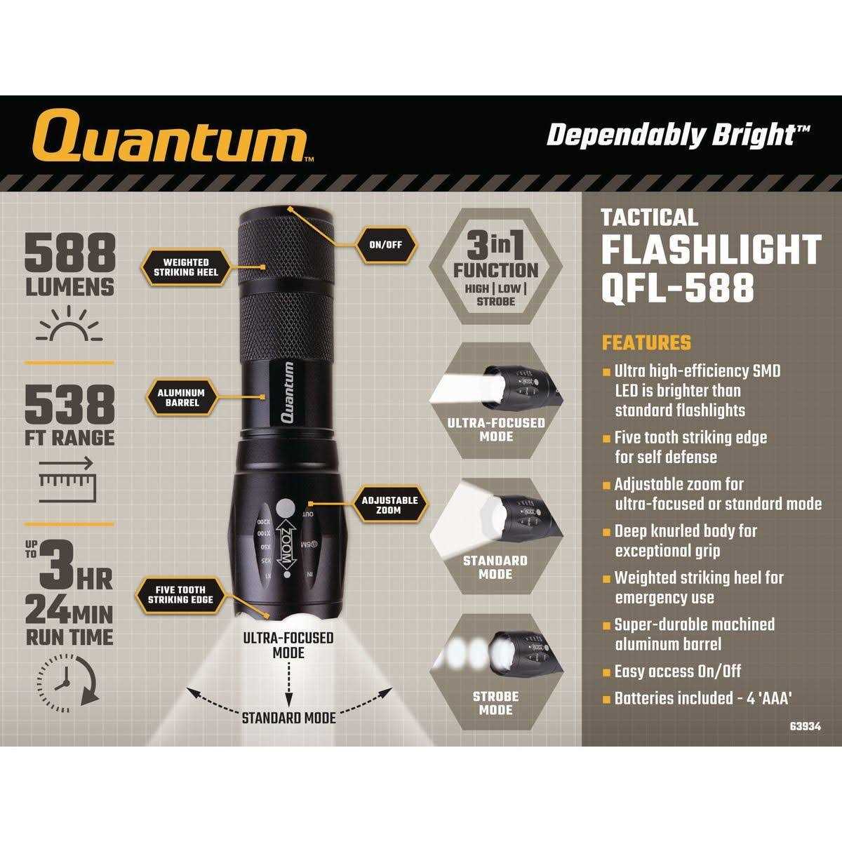 Description: This high output 588 Lumen Tactical Flashlight casts a brilliant beam of light up to 538 ft. away. The super rugged engineered aluminum body is designed for exceptional grip in all circumstances. The five tooth striking bezel and weighted striking heel provide the versatility you need for any situation. The ridged collar prevents rolling on smooth surfaces, giving you complete control of light placement. Ultra high-efficiency SMD LED is brighter than standard flashlights Five tooth striking edge for self defense Ridged collar to prevent roll-away on smooth surfaces Deep knurled body for exceptional grip Weighted striking heel for emergency use Super-durable machined aluminum barrel Easy access On/Off Includes 4 AAA batteries. Specifications: Name 588 Lumen Tactical Flashlight Brand Quantum Battery type Alkaline Battery(s) Included (y/n) Yes Battery(s) required 4 AAA Material Aluminum Range (ft.) 538 ft. Run time on full charge (hours) 3 hours, 24 minutes Product Height 1.48 in in. Product Length 5 in. Product Width 1.48 in.