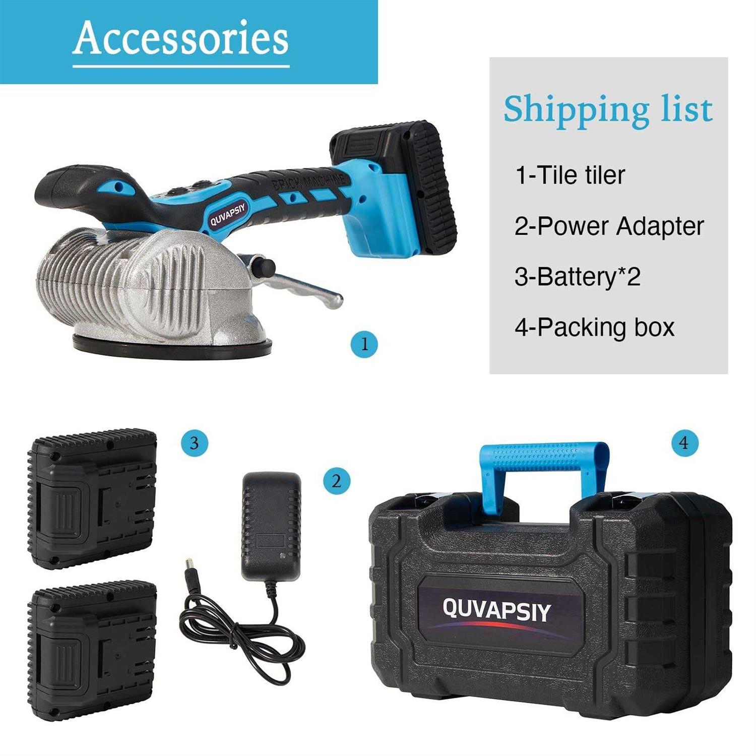 1. Dual 16.8V/10000mAh replaceable batteries to ensure uninterrupted usage. 2. Six adjustable speeds for improved vibration frequency and suction power of suction cups. Leveling effect and product quality exceeds that of competitors. 3. Upgraded waterproof and dustproof button panel makes the product easy to clean, durable and suitable for moving and installing 7.8-78 inch wall tiles and small floor tiles. 4. With a locking button, you no longer need to hold the lift lever throughout the entire installation process, reducing physical fatigue. 5. This tile machine tool is a must-have for any professional or DIY tile installer. p Description: /b – ul li Looking for a reliable and efficient tool to install tiles with ease? Look no further than the Quvapsiy Tile Vibration Tool! Our vibration tool comes equipped with dual 16.8V/10000mAh replaceable batteries to ensure that your work can continue uninterrupted, and provides six adjustable speeds to improve vibration frequency and suction power of suction cups. /li /ul p – ul li Our product’s level of leveling effect and quality exceeds that of competitors in the market, making the Quvapsiy Tile Vibration Tool the ultimate solution for tile installation. Whether you’re a professional or a DIY tile installer, this tile machine tool will make your job easier. /li /ul p – ul li The upgraded waterproof and dustproof button panel ensures that cleaning is a breeze, while also making the product more durable. Suitable for moving and installing 7.8-78 inch wall tiles and small floor tiles. With the locking button, you no longer need to hold the lift lever throughout the entire installation process, reducing physical fatigue and making the installation process even more efficient. /li /ul p – ul li Invest in the Quvapsiy Tile Vibration Tool and take your tile installation game to the next level! /li /ul