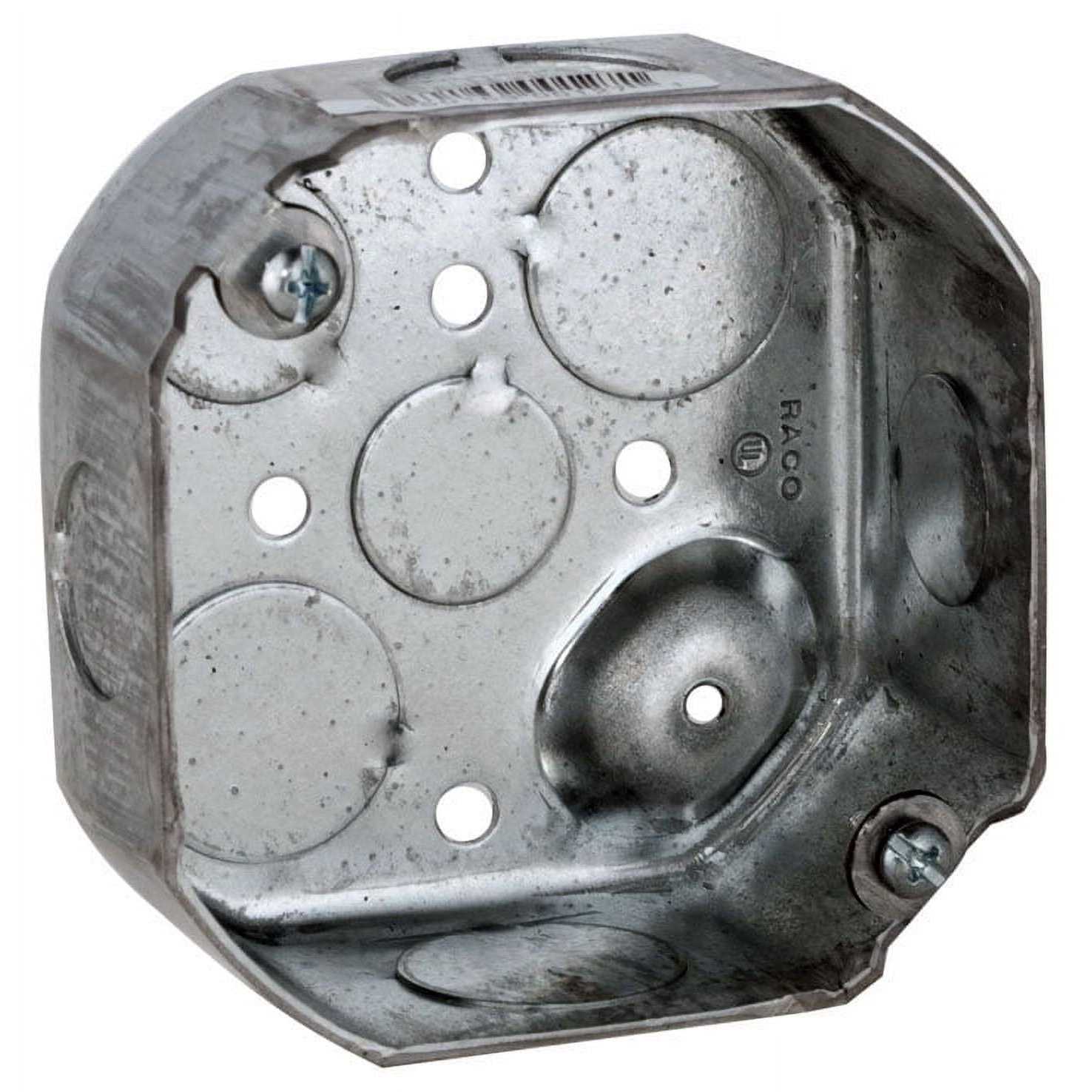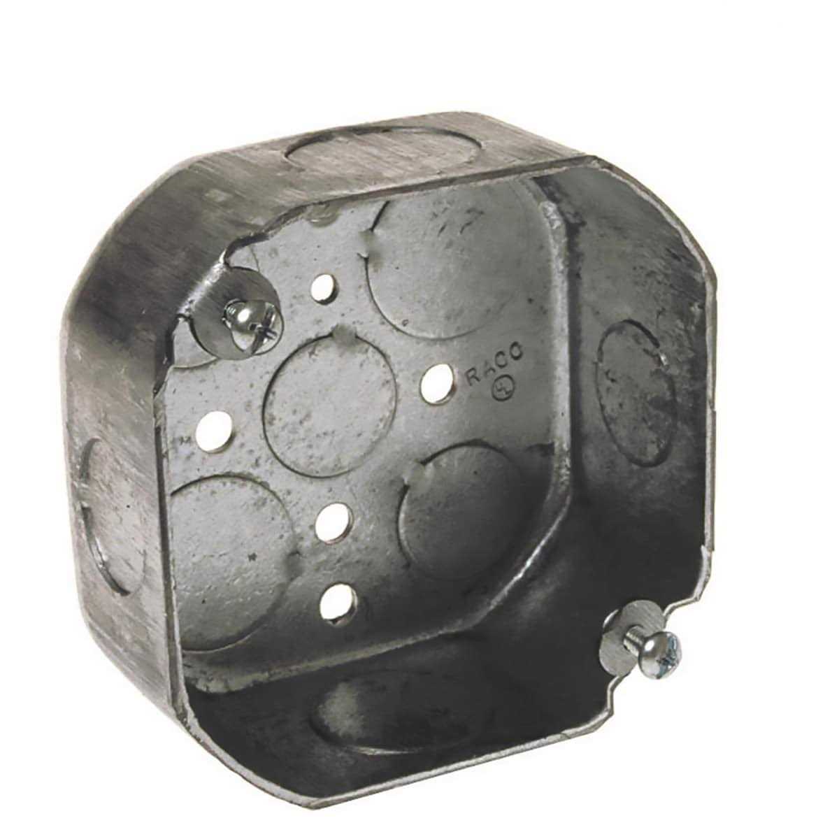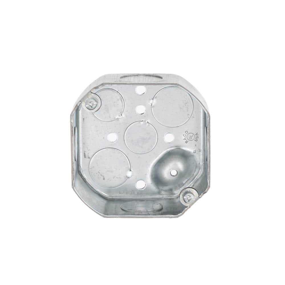 Octagon box 4 inch diameter x 1-1/2 inch deep has two 1/2 inch and two 3/4 inch side knockouts. Bottom has two 1/2 inch and two 3/4 inch Knockouts with a bump bottom ground hole. The box is used to install static ceiling or wall fixtures. With proper fitting can be used for conduit NMSC armored metal clad flex cable. The maximum support load for a static fixture is 50 lbs.