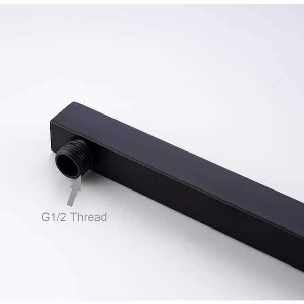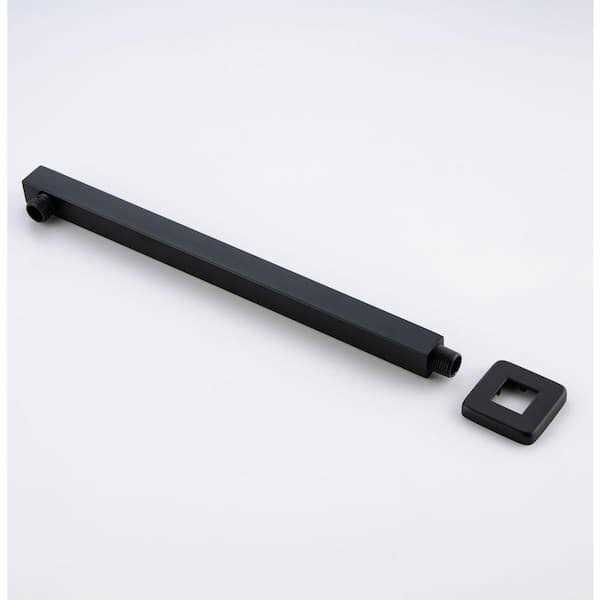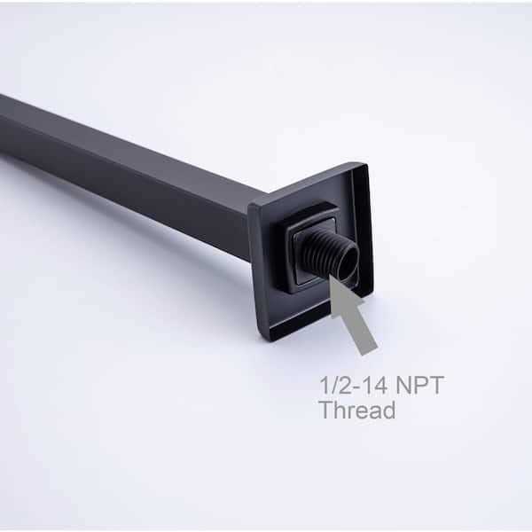 Solid stainless-steel construction, 16 in. length for you to enjoy rainfall shower. US and Canada output 1/2-thread compliant with most shower head and 1/2 in. NPT connector into the wall. 0.98 in. by 0.98 in. squared shower arm, 15.6 in. projection from wall space, 90° down outlet joint. Maximum works with 16 in. overhead shower package includes 1x L-shaped shower arm, 1x square flange. Easy to install without professional plumber. Color: Matte Black.
