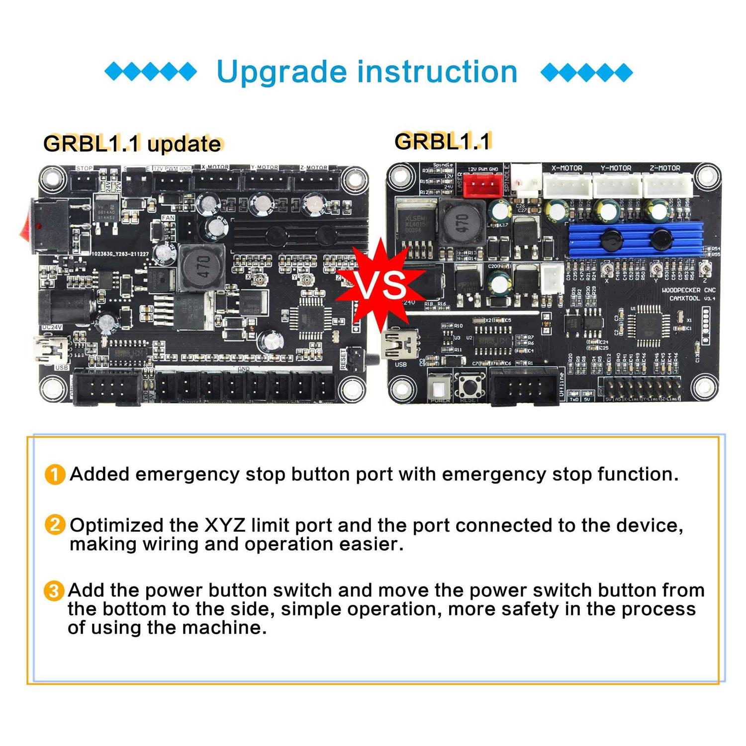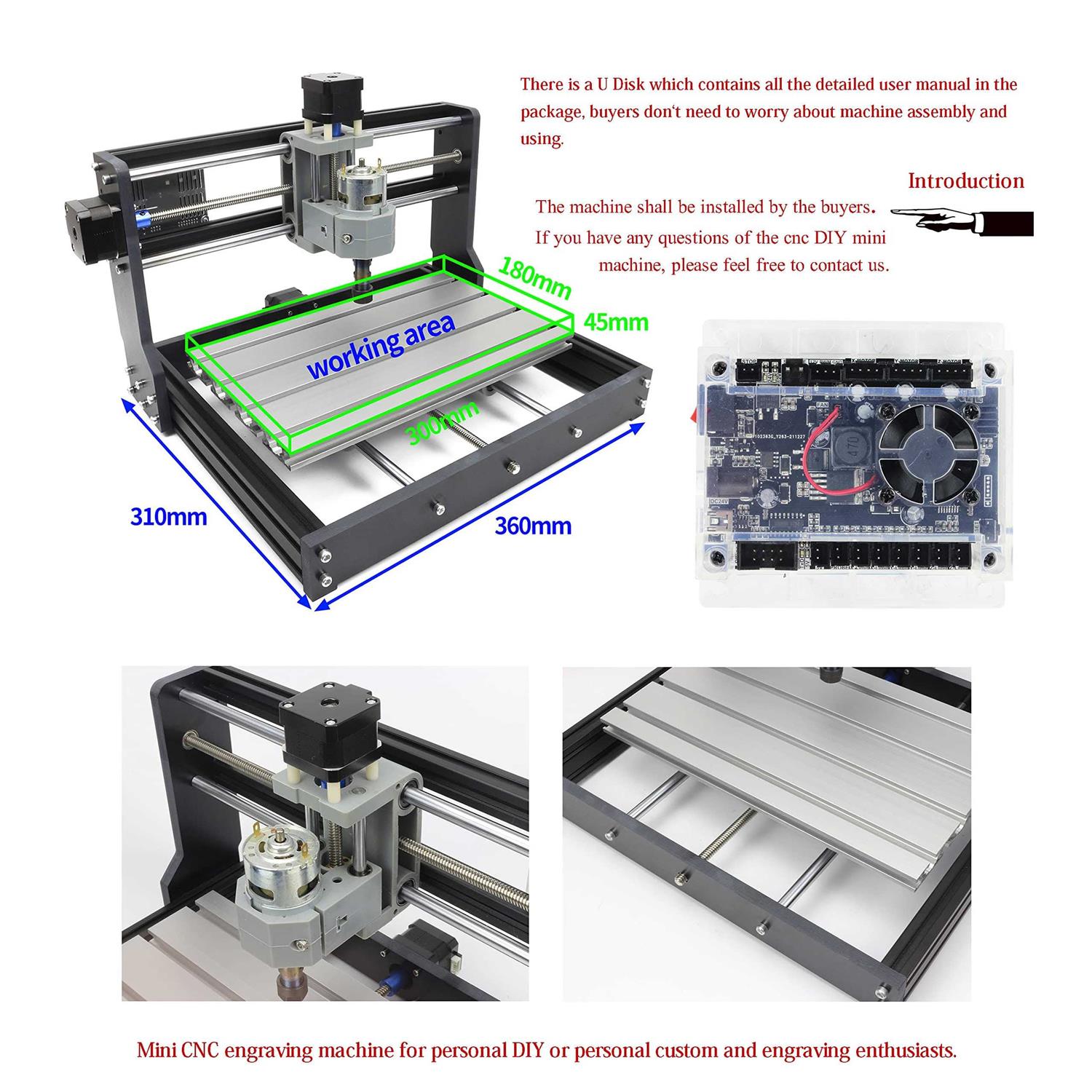 【Upgrade Version CNC 3018 PRO】Frame size: 40x33x24CM. Working area: 30x18x4.5CM. Material: Aluminum Alloy. Spindle: 775 spindle motor (12-24V) 24V:10000r/min. Stepper motor: 42 stepper motor, 12V, phase current 1.3A, phase resistance 2.1 ohms, torque 0.25N.m 【Simple Assembly/Use】This mini cnc router machine kit is mainly designed for DIY carving enthusiasts/beginners, easily assembled and opertated, coming with a paper manual and USB flash drive of all the files. 【Applicable Engraving Material】CNC 3018 PRO machine can not only engraving wood/plastic/acrylic/ pvc/pcb/carbon fiber/density board and so on, but also soft metal like copper, aluminum and the similar materials. Howerever, harder materials cannot be engraved such as glass, hard metal, jade, ect. 【Update GRBL1.1 Control Board】 1The GRBL board supports emergency stop and X/Y/Z axis limit functions, which can be used together with the emergency stop button and limit switch on the engraving machine to ensure a safe and simple working environment. 2Other functions and features such as: maximum support for 20000RPM spindle, 0.5W-20W module, tool setting(probe) , offline controller, with a power switch button and a silent fan cooling. 【CNC Offline Controller】This machine can be controlled simply by the offline controller without connecting it to a computer. Support SD card and TF card at the same time, standard capacity 1G. After inserting the file into the SD card,the engraving file can be directly identified. br
