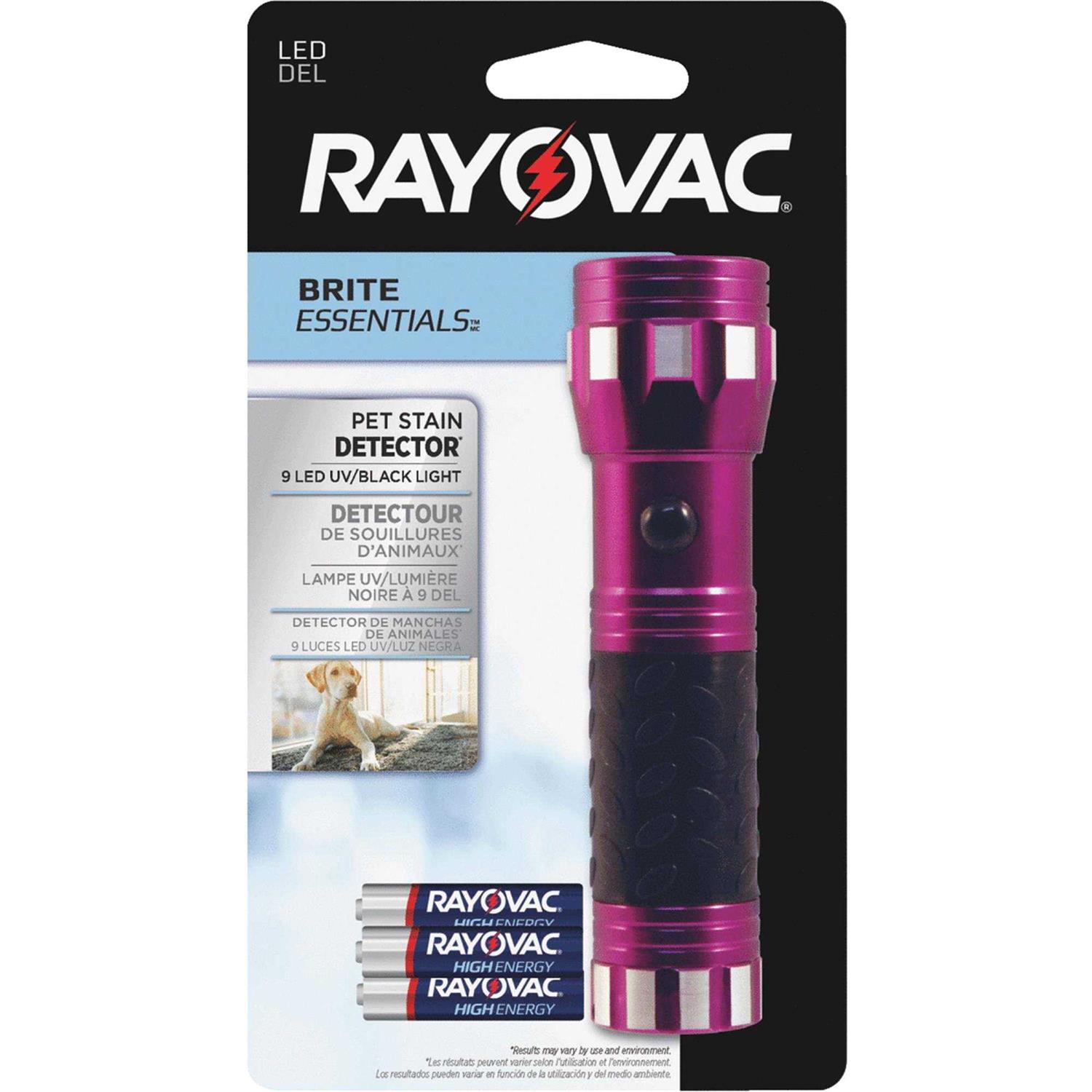 Be prepared to check for any problems and inconsistencies in your environment with this Rayovac Value Bright 9 LED UV Flashlight always on hand. This device is designed for detecting a wide range of materials and substances on surfaces. Rayovac LED flashlight can help you spot dog urine, pet stains, bed bugs and pests, automotive leaks, counterfeits, forensic material, cat pee and other general cleanliness issues in and outside the home. It has a compact, easy-to-carry construction and a rubber grip handle for ease of use. The Rayovac Value Bright 9 LED UV flashlight has a run time of up to seven hours on three AAA batteries, this light can get you through any activity or project. Your UV flashlight purchase comes with 3 AAA cell alkaline batteries.