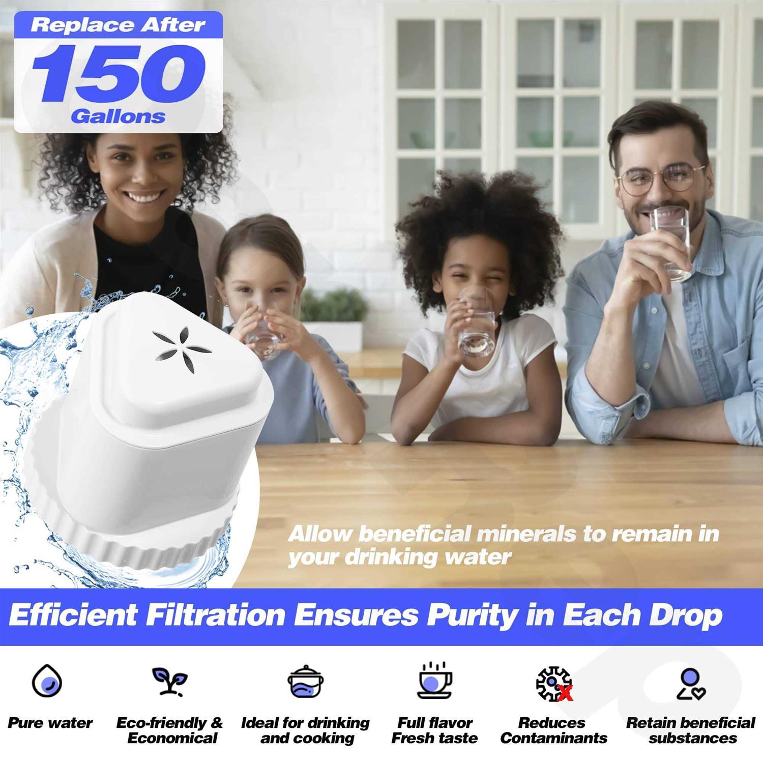 Tastier Water: Our water filters pitcher use a highly advanced filtration system to ensure maximum purification, each premium filter produces 150 gallons of fresh, pollution-free drinking water. Removes 99.999% of tap water pollutants. Smart filter media keeps healthy minerals in the water for healthier, tastier water. Compatible: This replacement filter fits for water filter pitchers, which is a great replacement for water filter pitchers. Water Pollutants Removal: The filter uses NSF-certified 6mm thick high-quality coconut shell activated carbon block. Retain Minerals: The selective filtration technology of the water filter pitcher retains the beneficial minerals naturally found in the water like calcium, potassium and magnesium for healthier, tastier water! Tastier Water: Our water filters pitcher use a highly advanced filtration system to ensure maximum purification, each premium filter