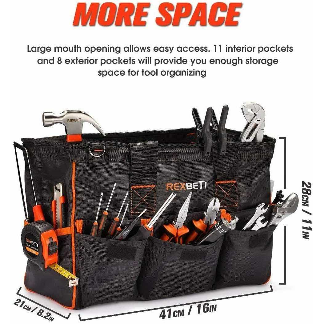 It is constructed with a durable fabric so it can withstand the load of your tools. The bag features a wide opening design for you to easily organize and take out your tools. More space – 11 interior pockets and 8 exterior pockets will provide you enough storage space for tool organizing.