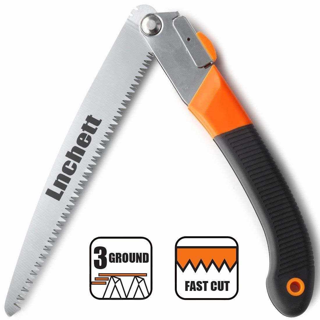 REXBETI tools only produce the superior quality products. that same high-quality fit and finish can be seen in this folding pruning saws. The aggressive staggered teeth provide an ultra-smooth cutting action, specifically designed for camping pruning survival bushcraft landscaping and general yard work. The blades are made from hardened SK-5 steel which create a harder, longer lasting cutting point. The textured rubber-padded handle feels great for both right and left-handed users. The saw blade locks in two different open positions, so whether you’re making overhand cuts or undercuts, you still have maximum cutting power and control.