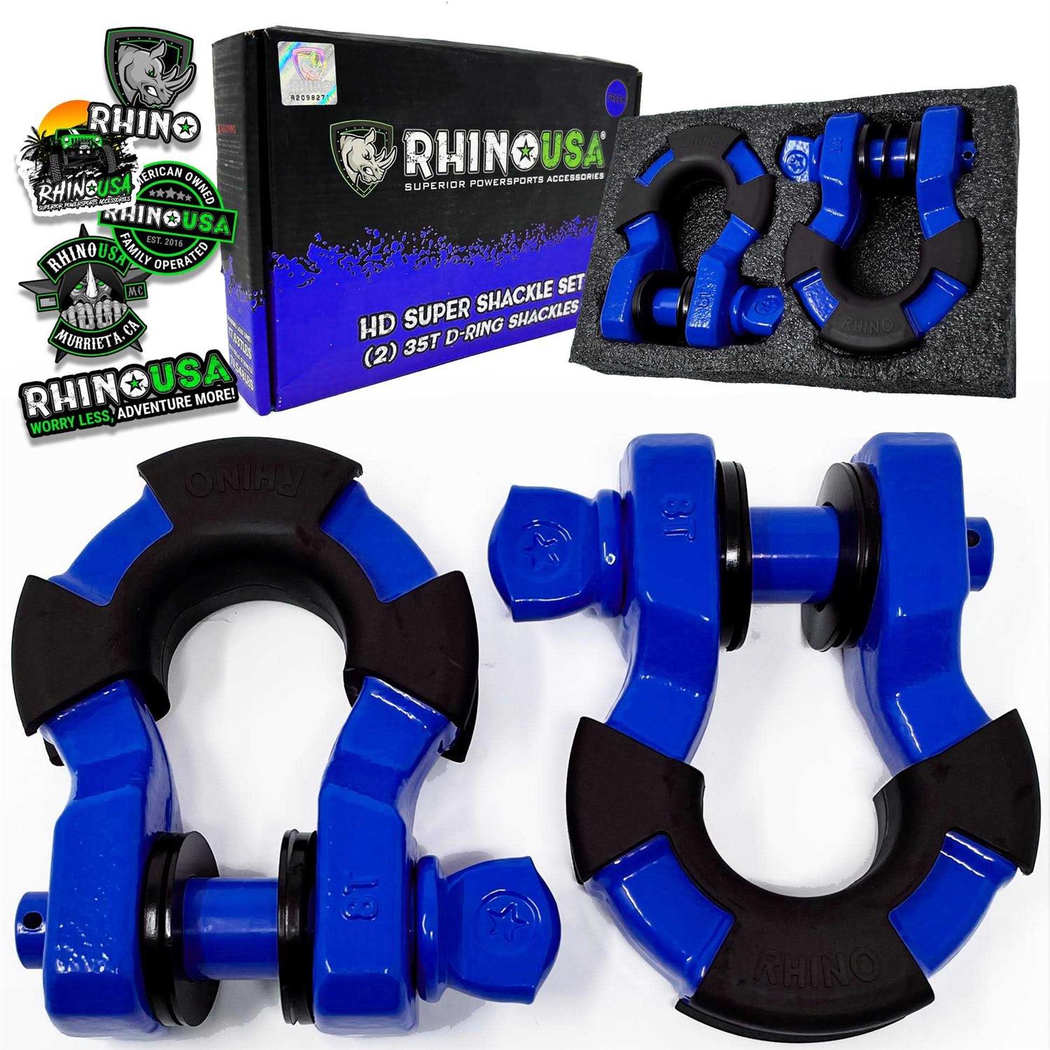 Rhino USAs Super Shackles feature a large shackle body with reinforced ribbing for added structural rigidity, cotter pins to keep the attachment pin in place and redesigned isolators for maximum durability. These shackles utilize a standard 7/8 pin, which will work with most mounting flanges and aftermarket bumpers. Each D-ring has a max break strength of 70,548 LBS and a working load limit of 17,637 LBS. The opening of the shackle has a span of 1.25, and the included rubber washers can be used to make up any negative space when mounting, reducing noise and vibration.