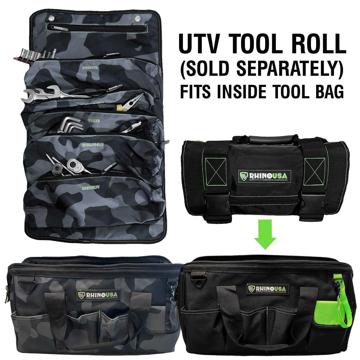 AMERICAN OWNED, FAMILY OPERATED – Join the Rhino Family & Support a USA based Father/Son Business! Made from heavy duty 500D nylon/polyester blend, this tool tote is designed to withstand the most rugged and demanding repair situations and can hold up to 80 LBS of tools and parts. The formed bottom allows for added structural rigidity, and the waxed canvas like material is water resistant and will protect your tools from the elements when out four wheeling. The included shoulder harness is a great feature, and the E-clips allow for easy configuration to best suit your needs. Bag dimensions are 24”x8”x12” (LxWxH). The increased length allows storage of larger power tools, so you can travel with peace of mind knowing you are prepared for whatever the trail throws at you! This bag is perfect for electrical, automotive, construction, carpentry and much more. The internal pockets allow for easy organization of equipment, saving you time when preforming a repair. The open top also allows for easy access, meaning less time spent looking for tools! Please note, tools are not included.