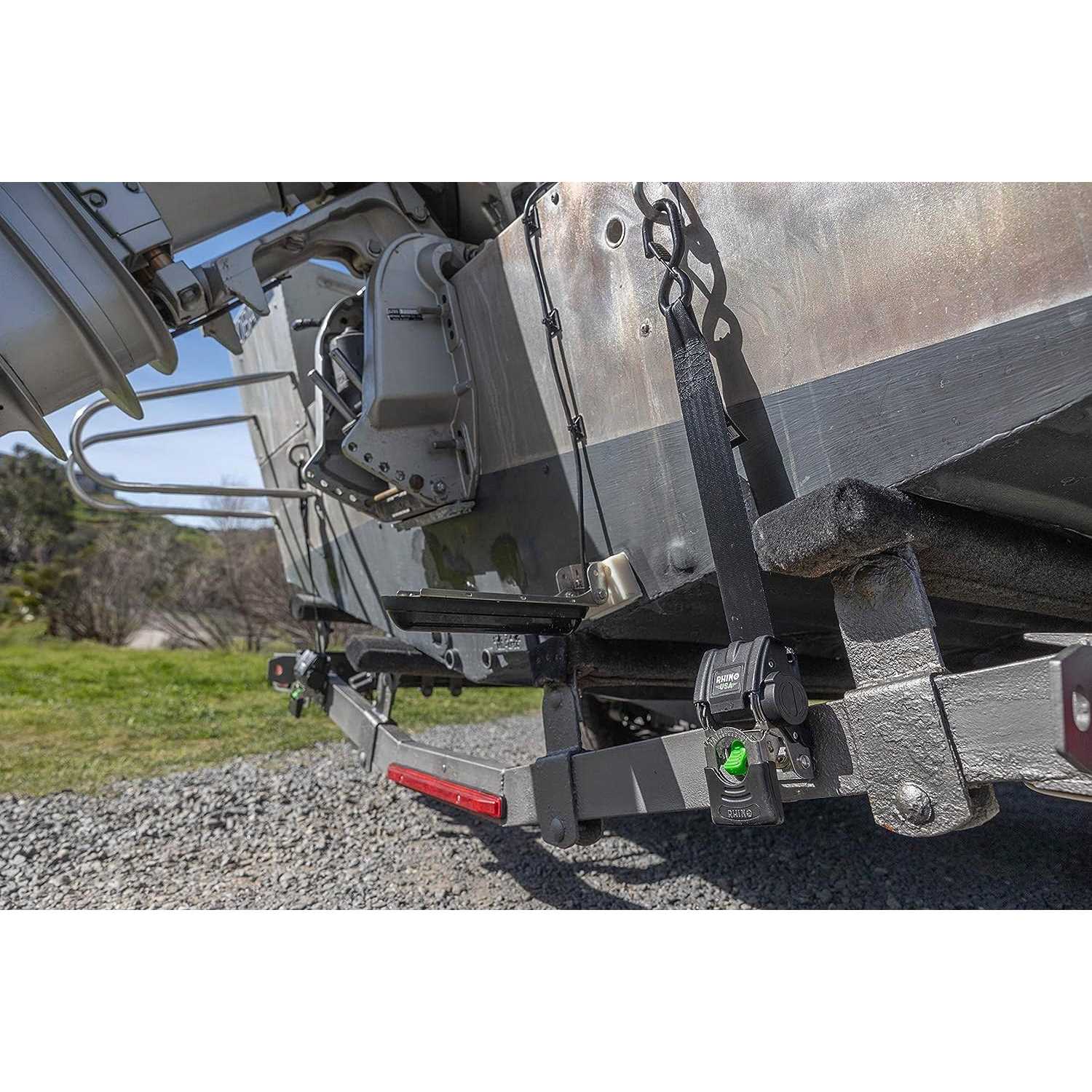 AMERICAN OWNED, FAMILY OPERATED – Join the Rhino Family & Support a USA based Father/Son Business! INSTANT AUTO RETRACT STRAP – Buckle Automatically Retracts to Secure Your Watercraft to the Trailer. QUICK & EASY INSTALLATION – Buckles Easily Bolt Down to Your Trailer With Included Hardware (2 Bolts) CONFIDENCE & PEACE OF MIND – Knowing your Pontoon, Bass, Jon or Fishing Boat is Secure when Trailering. Gone are the days of fumbling with bulky and tangled straps that can be difficult to manage. Our retractable straps are easy to use and designed to make securing your boat a breeze. The innovative design allows you to quickly and easily retract the straps when not in use, keeping them neatly stored and out of the way. Made with durable materials, our transom straps are built to withstand the toughest conditions, ensuring your boat stays safely and securely in place during transportation. The straps are adjustable to accommodate a variety of boat sizes, and the stainless-steel hardware provides added strength and durability. Whether you’re an avid boater or just getting started, our retractable boat trailer transom straps are a must-have accessory for any boat owner. Don’t risk damage to your boat during transport – invest in the peace of mind that comes with knowing your boat is securely fastened to its trailer.