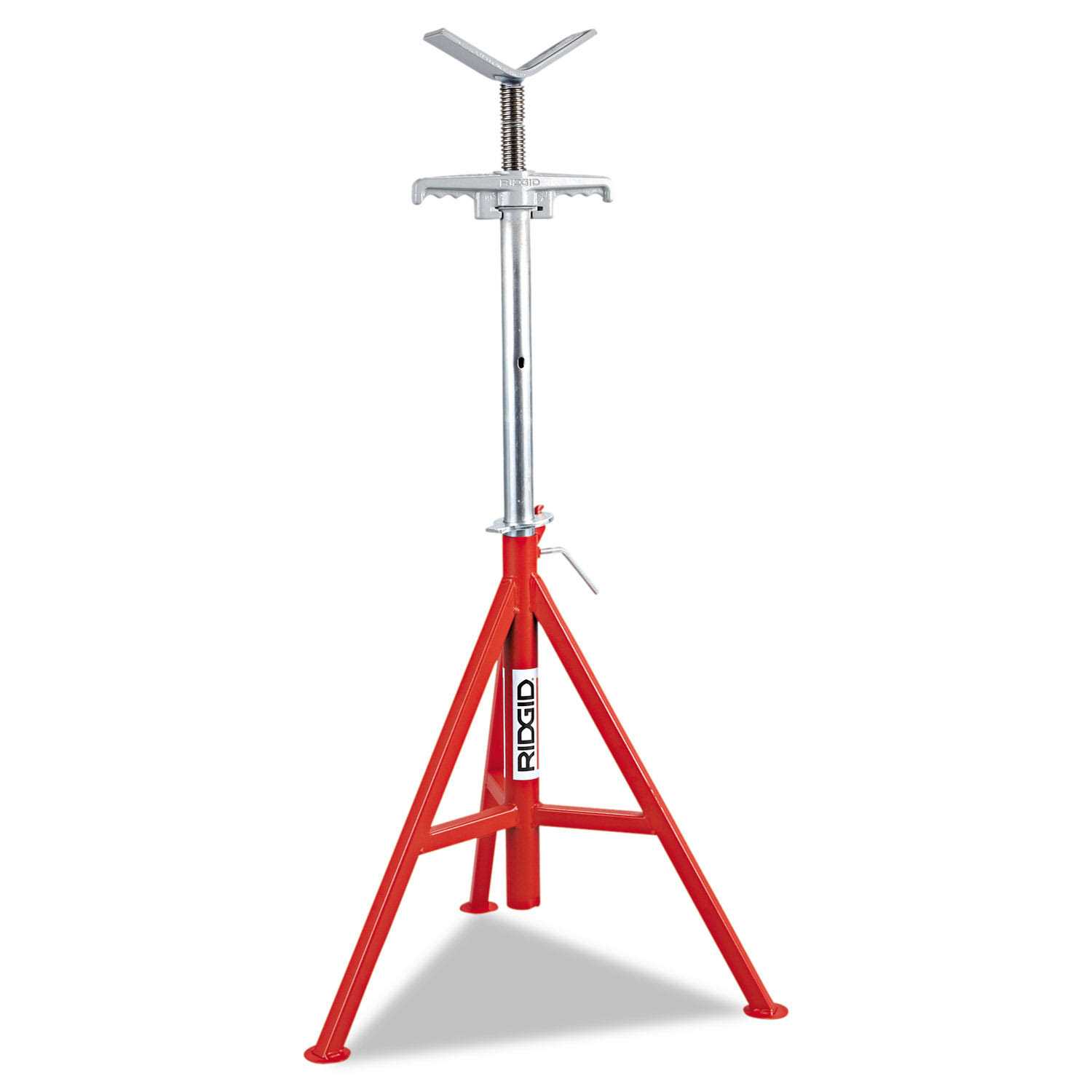 Heavy-duty stand features all-steel construction for strength and durability. V head centers and cradles various sizes of pipe. Angled grips allow for comfortable hand position during transport and height adjustment. Height-adjustable between 28 inches and 52 inches. Handles pipes up to 12 inches in diameter. Locking ring allows for quick height adjustments.