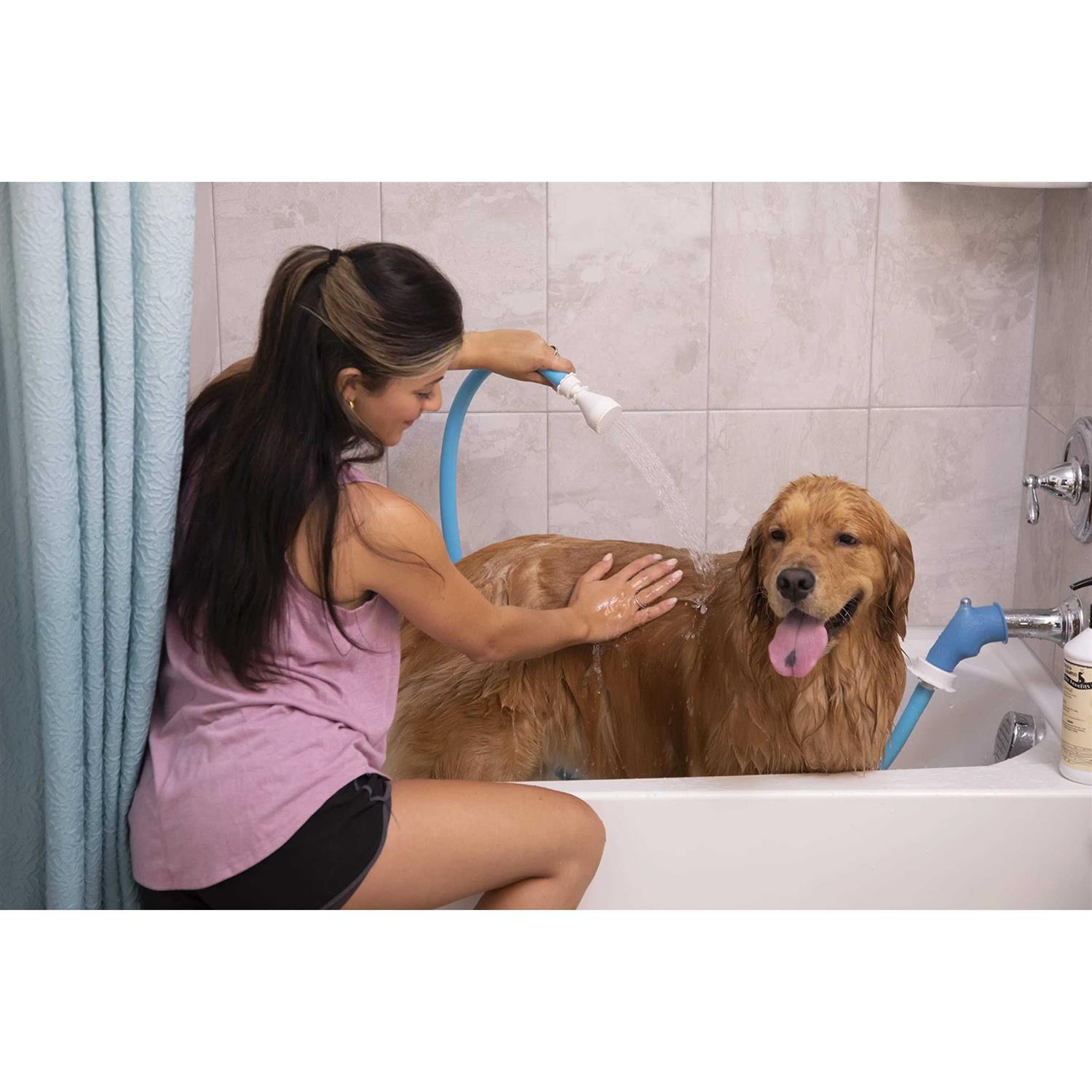 Rinseroo Bathe Anywhere Pet Rinser Hose Attachment, 5-ft, Blue; The Rinseroo Bathe Anywhere Pet Rinser Hose Attachment is reinventing the way you wash your pet, shower and just about anything else that needs a good cleaning! Rinseroo’s rubbery connector can stretch up to five times its size, so it can easily slip onto any shower head or faucet up to six inches in diameter. There are plenty of ways to use the Rinseroo—place it over your fixed shower head or sink faucet to easily bathe your pet without a tub or bucket. It’s also great for filling portable washers, buckets and other containers. Whether you use it as a shower aid or cleaning tool, Rinseroo can help you finish your chores and clean up in record time. The lightweight design is easy to move throughout your house, coil up and store. Plus, each Rinseroo comes with two rubber connectors for long-lasting use.