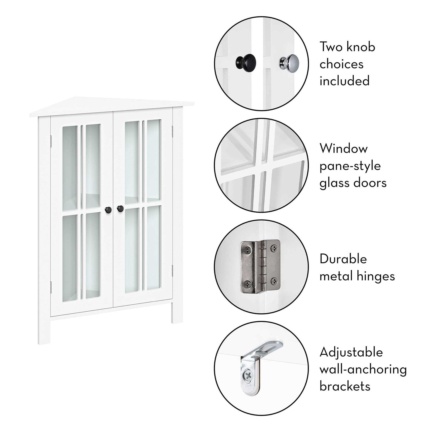 Maximize storage space with this stylish two-door corner cabinet. Featuring two windowpane-style doors with soft-close hinges and one fixed interior shelf, this cabinet makes an ideal storage solution in tight spaces. With its smooth, white painted finish, this versatile design is ideal for bathrooms, living rooms, offices and more. Stow away extra toilet paper, soap bottles and a variety of other items behind the double doors, then display your favorite decorative items on the open top shelf. To customize the look, add the knob color of your choice to the doors (polished silver and black options included). For added safety and stability, secure to the wall with the included adjustable anchor brackets. Includes detailed instructions for easy assembly. Pair with any of the additional RiverRidge Home Danbury Collection items to give your bathroom a fresh new look.