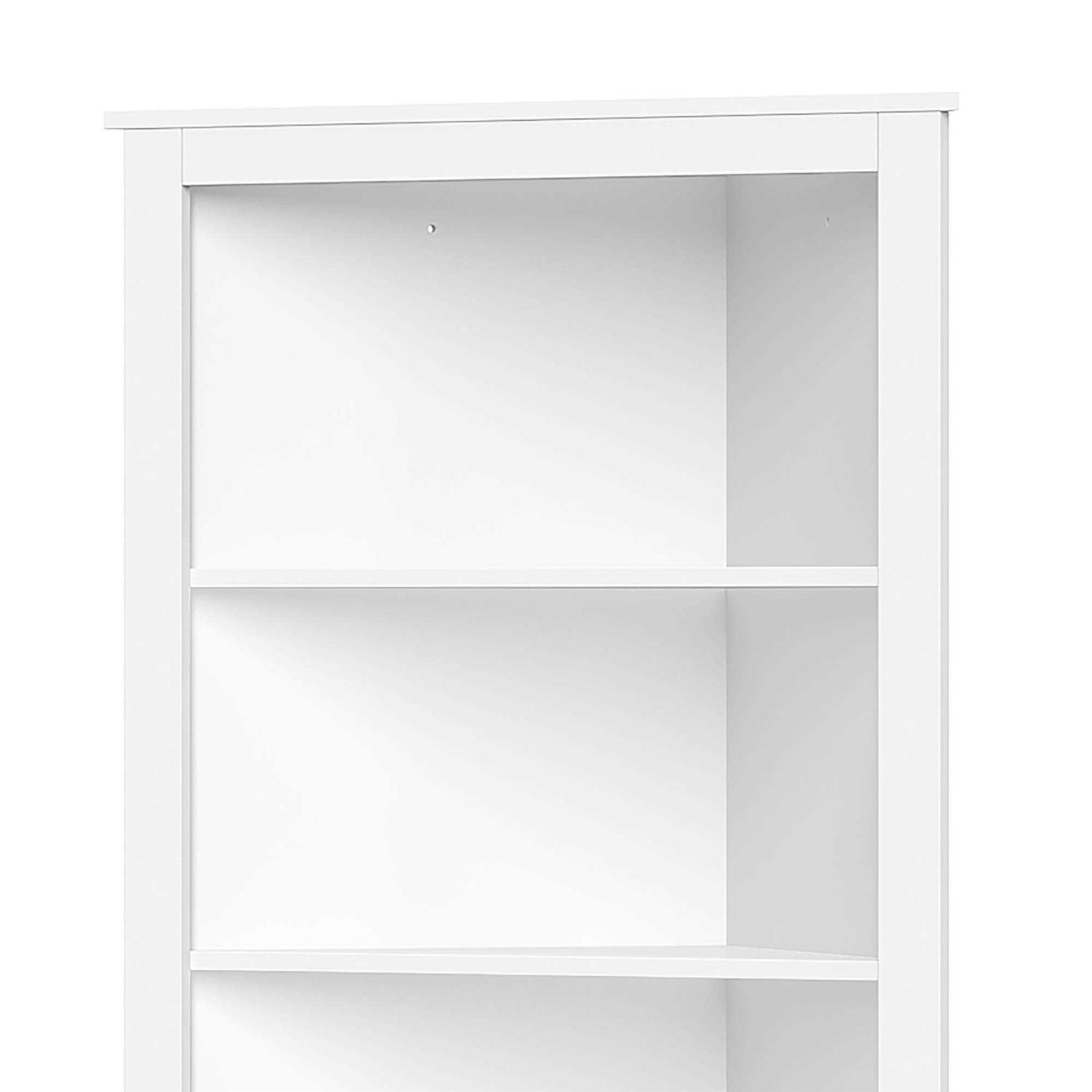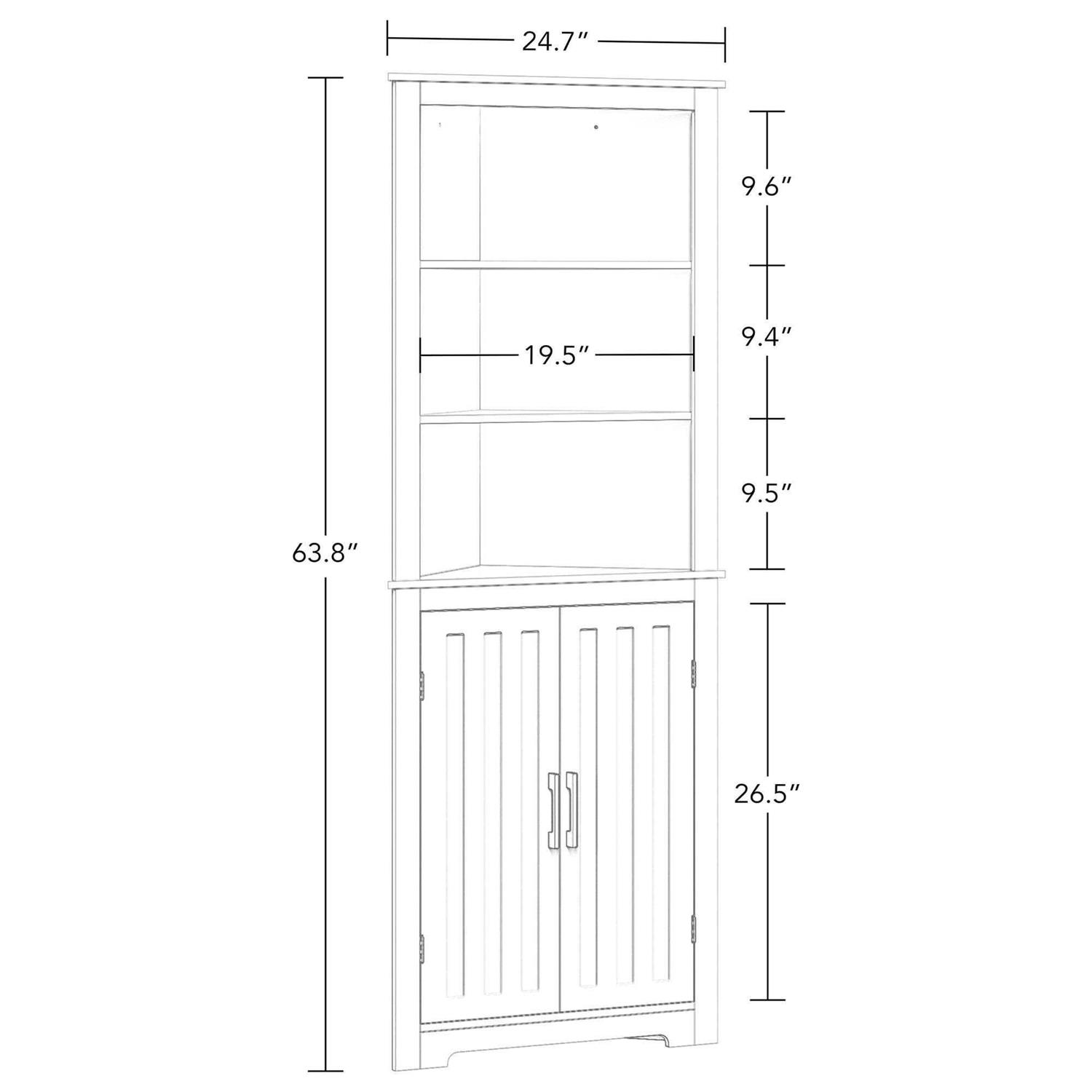 This spacious corner cabinet design features both open and interior shelves for a variety of storage and display options. Three open shelves are perfect for displaying photo frames, plants, and other decorative items. Two doors feature vertical inset paneling and matte black handles adding a classic, modern look to your space. Cabinet interior contains one fixed shelf and one adjustable shelf that moves up, down or out for shelf heights customized to your storage needs. Easy-to-follow assembly instructions and wall mounting hardware are included for simple installation, added stability and safety. Give your space a fresh, up-to-date look with the entire Monroe Collection.