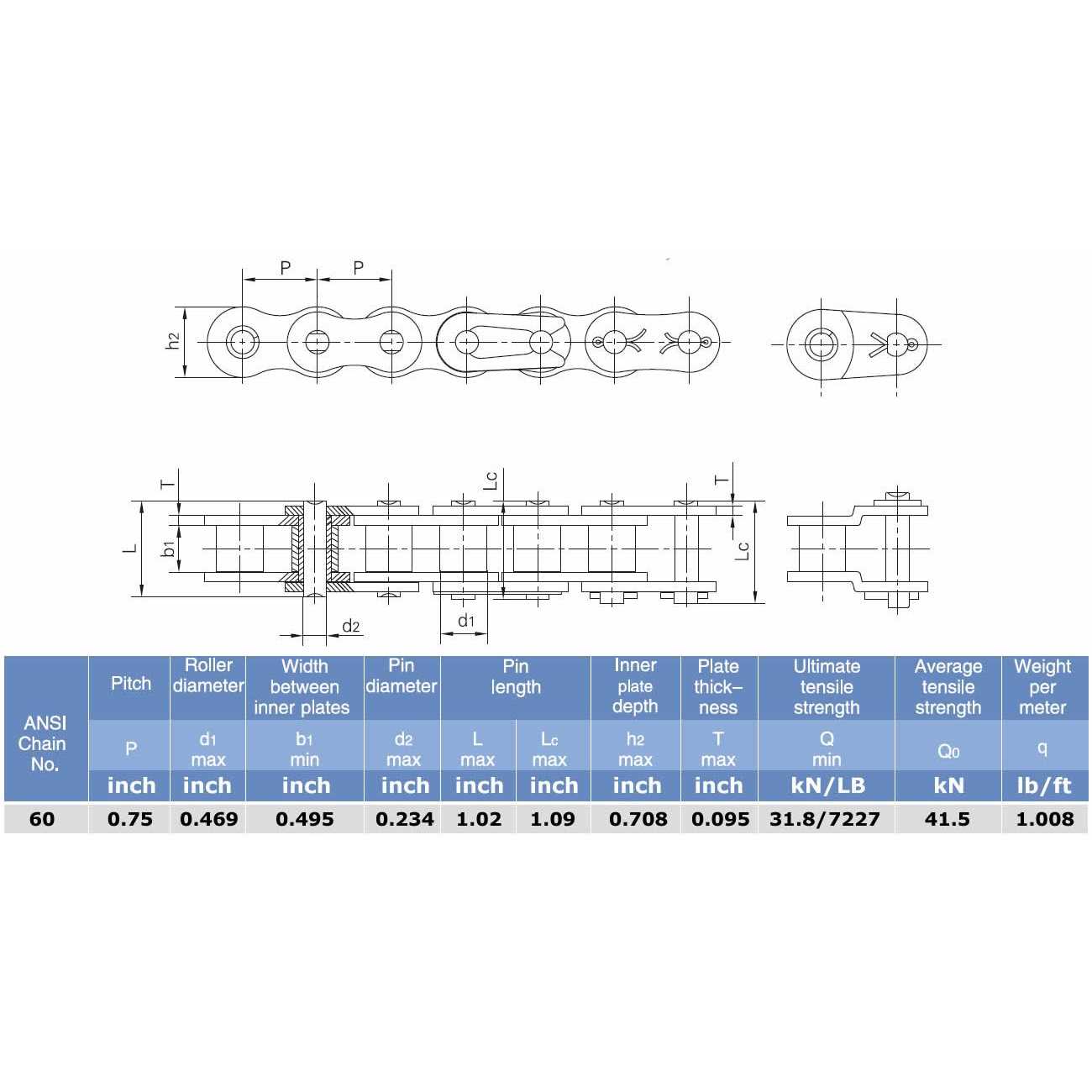 ANSI Chain No.: #60 Length: 10 feet Pitch : 0.75 inch (19.05 mm) Roller Diameter (d1 max): 0.469 inch (11.91 mm) Width Between Inner Plates (b1 min): 0.495 inch (12.57 mm) Pin Diameter (d2 max): 0.234 inch (5.94 mm) Pin Length (L max): 1.02 inch (25.91 mm) Pin Length (Lc max): 1.09 inch (27.69 mm) Inner Plate Depth (h2 max): 0.708 inch (17.98 mm) Plate Thickness (T max): 0.095 inch (2.41 mm) Ultimate Tensile Strenght (Q min): 31.8 kN (7,149 lb) Average Tensile Strenght (Qo): 41.5 kN Weight (q): 1.008 lb/ft (1.5 kg/m)