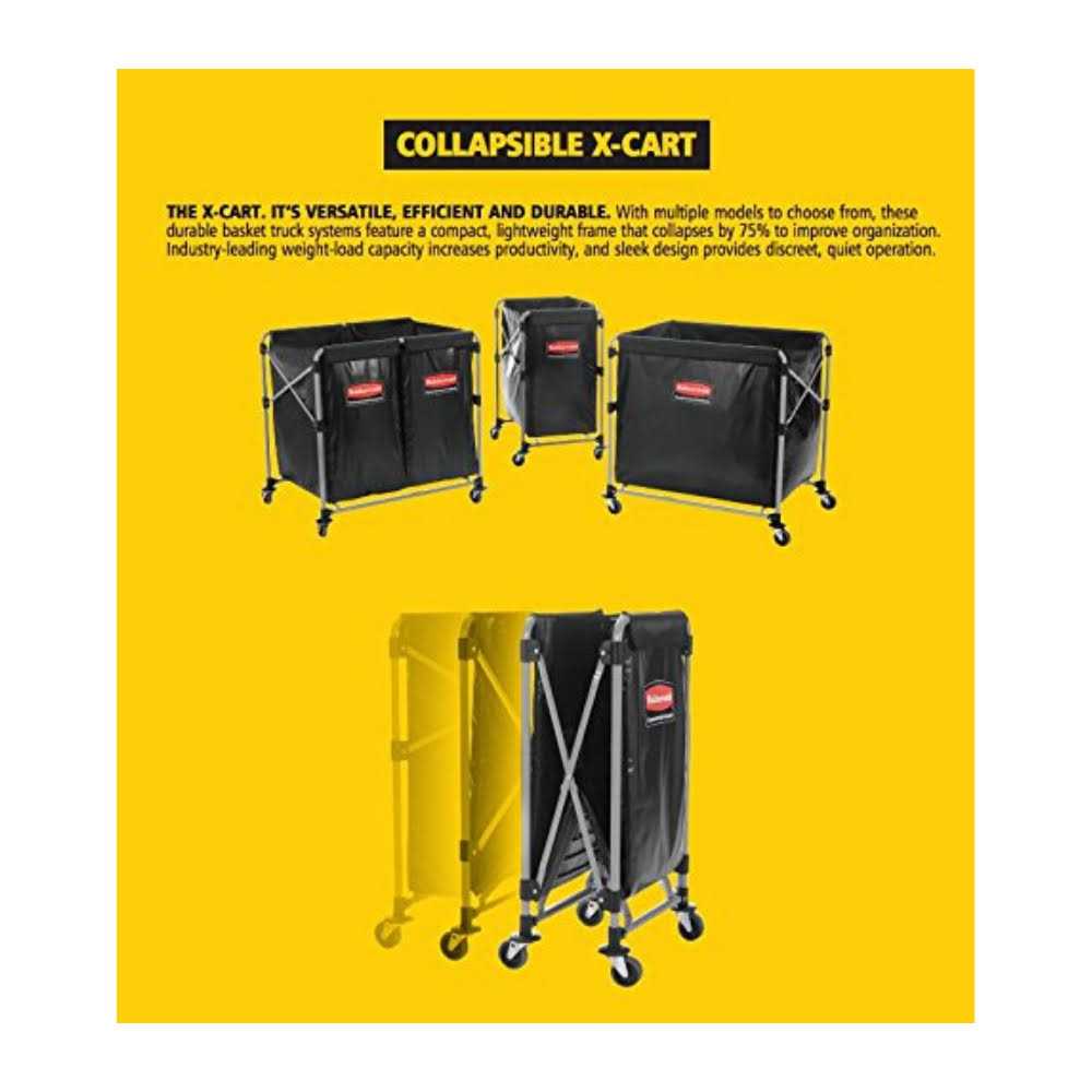 Features. Durable easy-to-maneuver basket truck efficiently transports large bulk loads and then you can conveniently collapse it to minimize storage footprint. Cart’s width is reduced by 75 percent when collapsed. Collapsible X-Cart stays upright in the collapsed position. Robust stainless steel powder-coated frame prevents rusting and supports 220 lbs. of load. With the Multi-Stream advantage the 8-bushel capacity is split into two baskets to easily divide and sort materials. Color-coded ribbons classify transport materials to prevent cross-contamination. Premium quiet casters swivel for superior maneuverability. Bumper guards add extra protection during transport. Detachable bag is easy to clean.