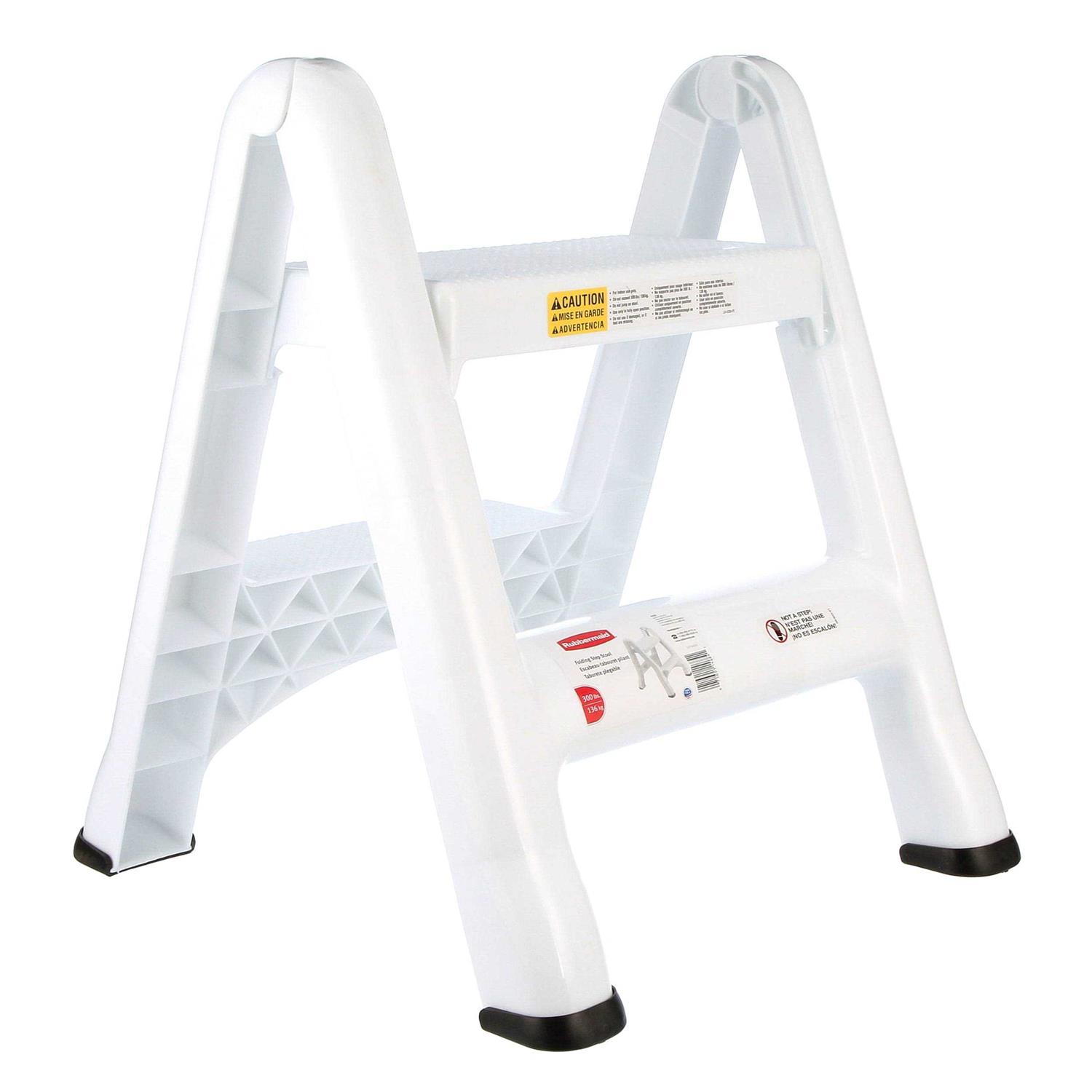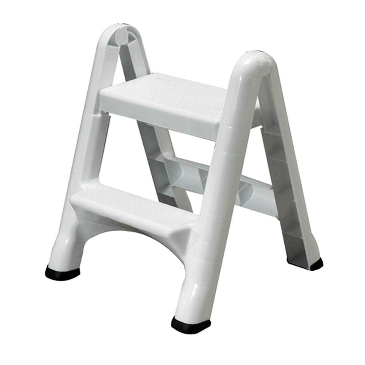 Resistant to rust and dents and easy-to-clean. Convenient and lightweight carrying and enhanced mobility. Stands upright on its own when folded. Slim width takes up minimal storage space in home. 4 skid-resistant foot pads. White. Folded: 24.823 H. x 19.517 W. x 6.598 D. In use: 22.25 H. x 19.517 W. x 20.75 D. No. FG420903WHT: Load Capacity: 300 lb, Ladder Height: 22-1/4, Top Step Height: 23, Number of Steps: 2, Material: Plastic, Color: White, Folded Size Width: 19.517, Folded Size Depth: 6.598