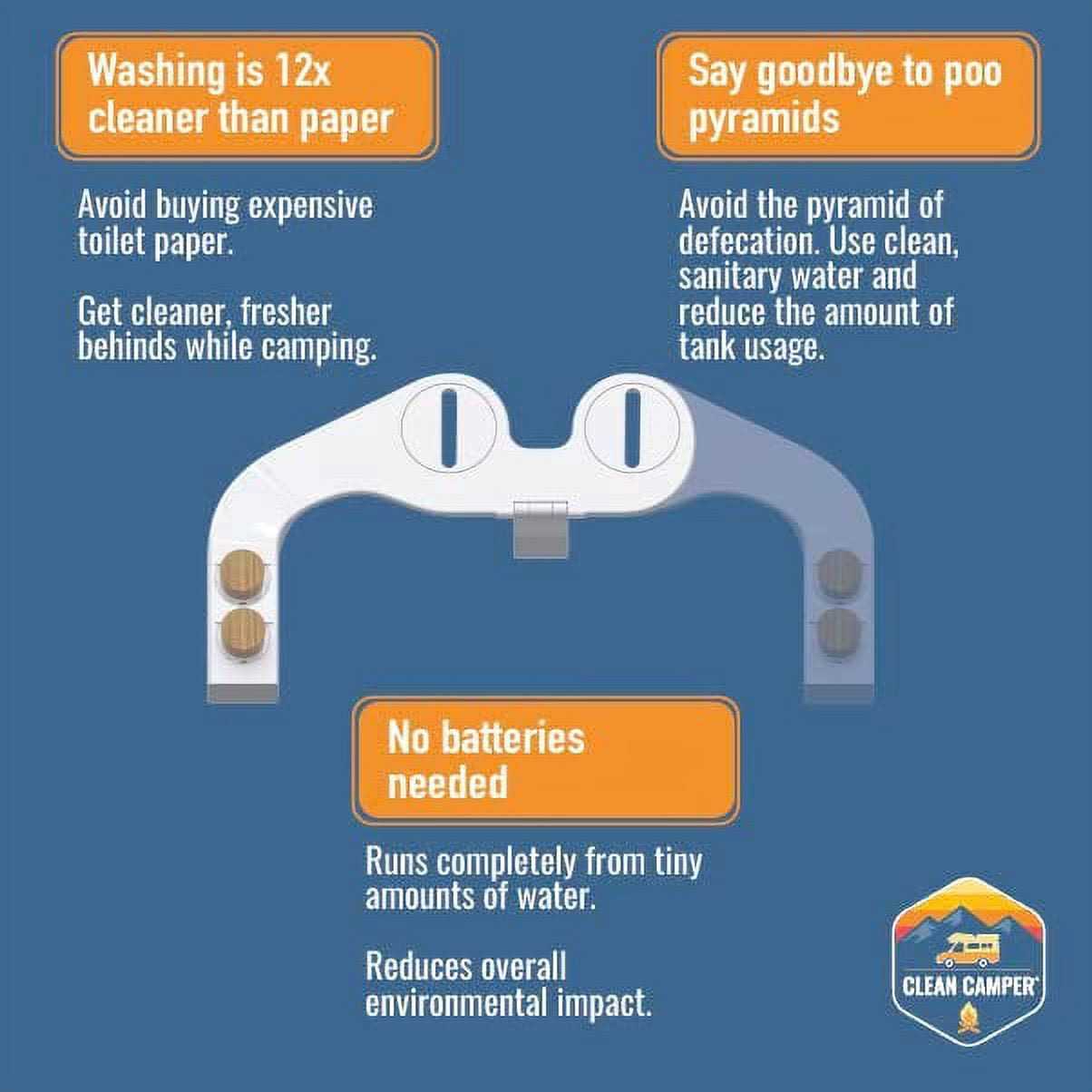 Cleaners by Clean Camper. Details:Reversible RV Bidet from Clean Camper. Dual action, non electric, and self cleaning, this incredible bidet will leave you clean while saving toilet paper and money.
