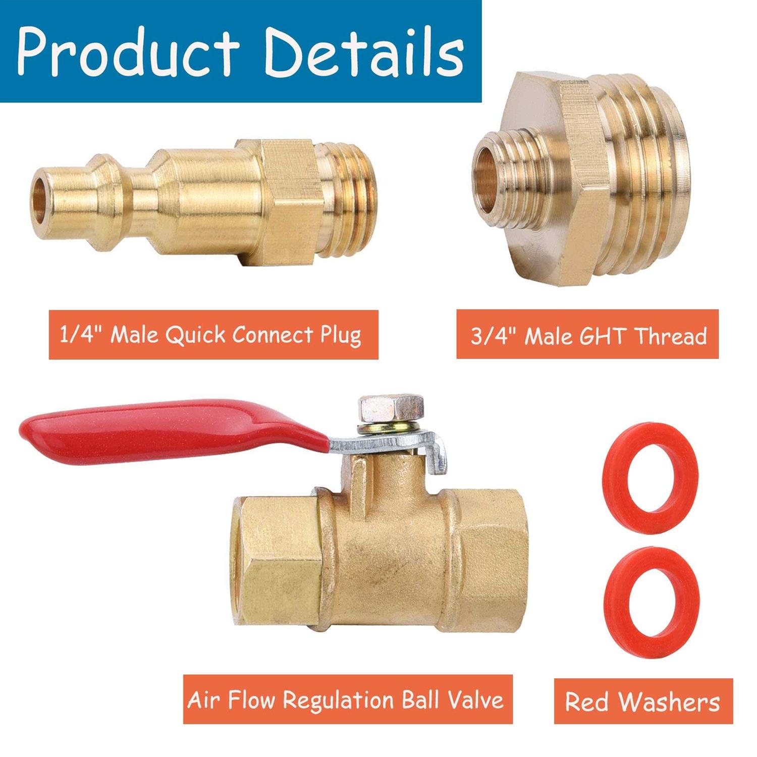 Wish you a happy shopping. ** **About this product:** The winterize blowout adapter use a convenient anti-freezing method to winterize water lines of travelling vehicles such as RV/camper/boat/travel trailer, by blowing out water from the water lines/plumbing . It can reduce the use of antifreeze, very convenient. The winterize blowout adapter use standard threading – 1/4″ male air compressor quick plug to a male 3/4″ garden hose inner thread, attach air line to water lines/hose system easily. On one hand, suitable for most water system – RV boat camper travel trailer such vehicles which with water supply system. On the other hand, use to blow out/winterize any water system with an male garden hose thread, like garden hose, faucets, sprinkler systems and outdoor water lines. **Tips:** Red Plastic-covered lever handle for on/off manual control. For vehicles winterizing – working pressure is about 25-30psi. For garden hose winterizing – working pressure is about 45-55psi. For long-time runs – stop and let the air compressor cool off every few minutes. **Package including:** 1 × Winterize Blowout Adapter with Ball Valve 1 × 1/4″ Male Quick Connect Plug 1 × 3/4″ Male GHT Thread 2 × Red Washers