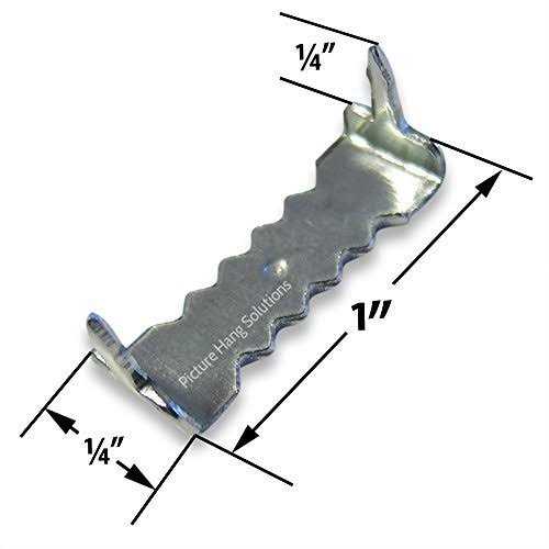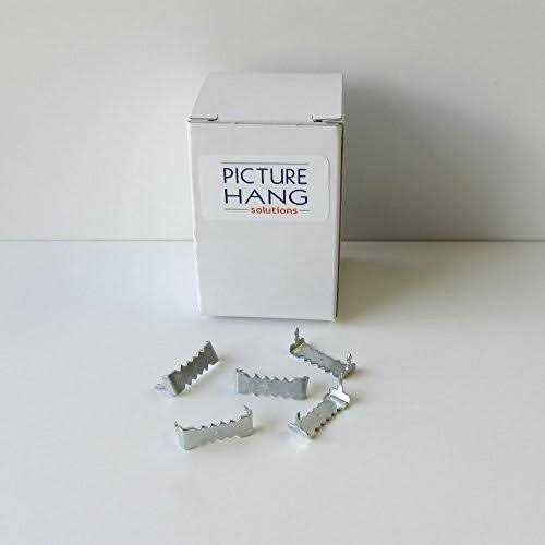 Picture Hangers by Picture Hang Solutions. Details: Our silver finish nailess sawtooth hangers are made of steel and zinc plated. Each sawtooth has two pronged “legs” that enable it to be attached to a wood picture frame without screws or nails. The hardened finish is strong to prevent the sawtooth from bending while hammering it into the frame. Nailess Sawtooth Hangers install very quickly–an important advantage if you have a lot of frames to hang. Pilot holes are usually not necessary unless you are using very hard woods like oak or ash. Sawtooth picture hangers are easy to use and work well on small wood picture frames, stretched canvases, framed photos, bulletin boards, framed posters, framed diplomas, wood craft projects, pallet wood projects.