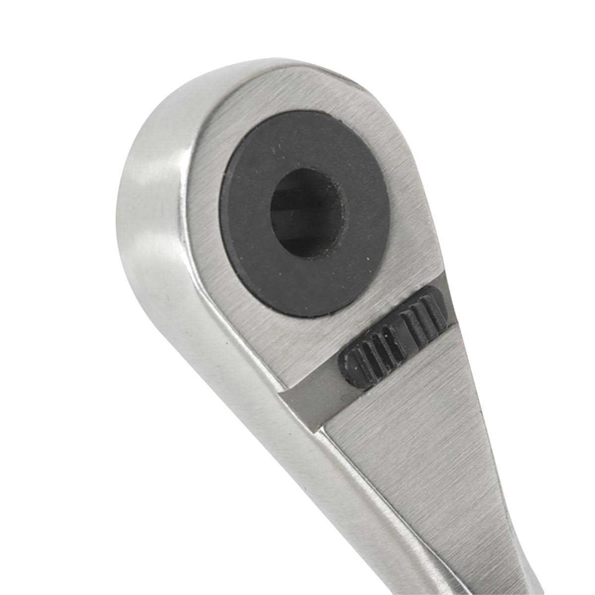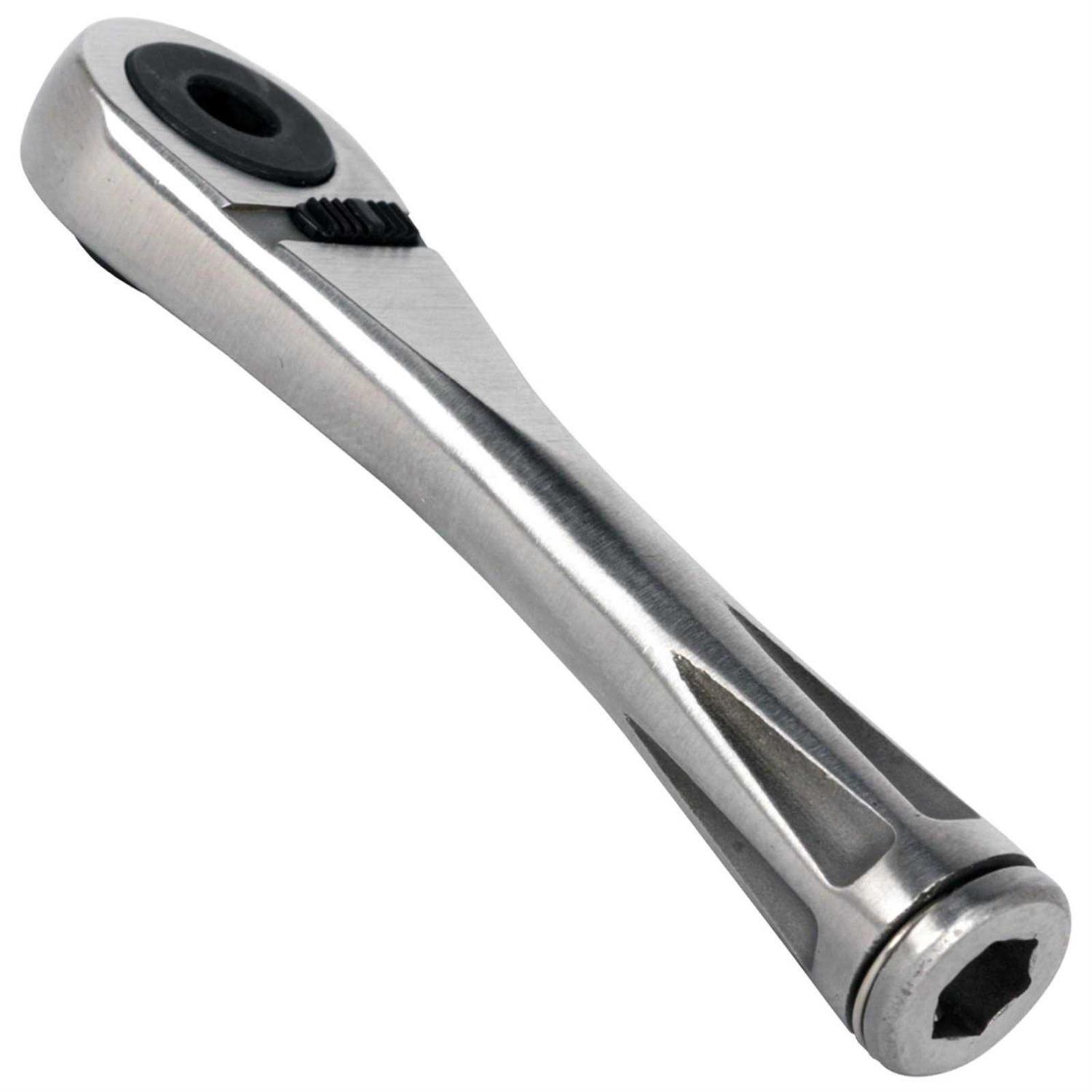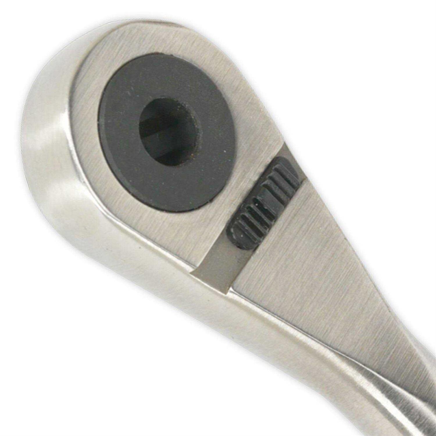 Manufactured from high quality stainless steel with a fully polished satin finish. 72-Tooth ultra-smooth ratchet with slide reverse. Additional drive at the base of handle. Ideal for limited access applications.