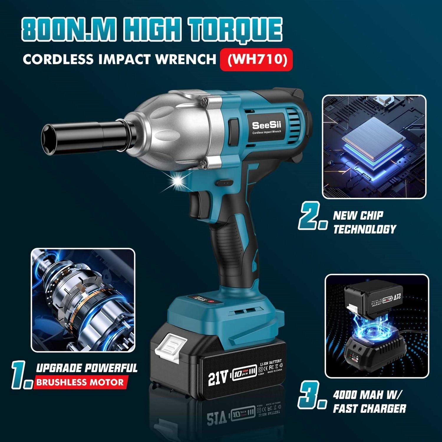 Seesii Cordless Electric Impact Wrench 1/2 inch for Car Home, 580Ft-lbs(800N.m) Brushless