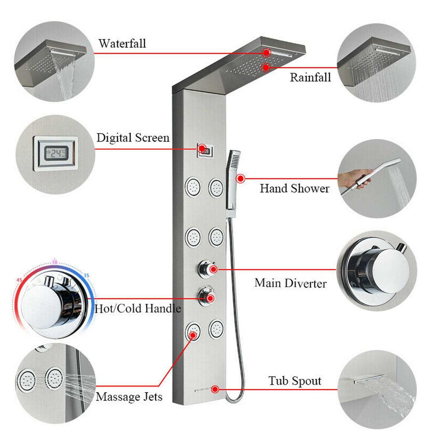 This 48 inch Shower Panel Tower System Stainless Steel 5 in 1 Multi-Function Shower Panel with Spout Rainfall Waterfall Massage Jets Tub Spout Hand Shower for Home Hotel Resort Split Type can do it for you. The sprinkler design makes you comfortable when taking a bath.It can bring you a good feeling from head to toe just like massage. Itis really a good assistant to ease fatigue and tiredness. What a good shower product for you! Come on and never miss it.