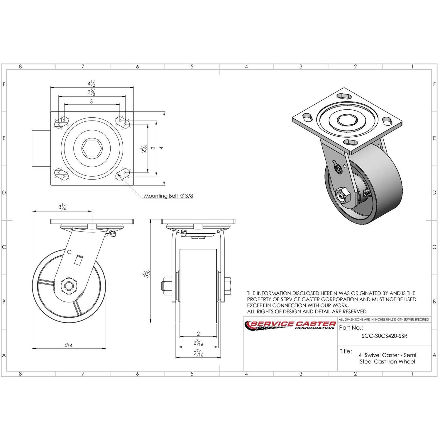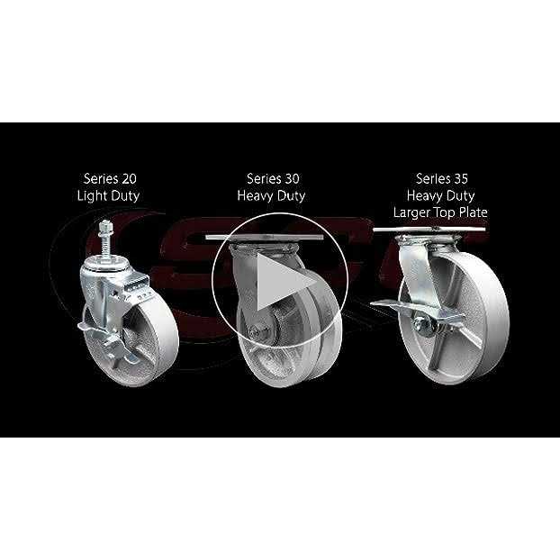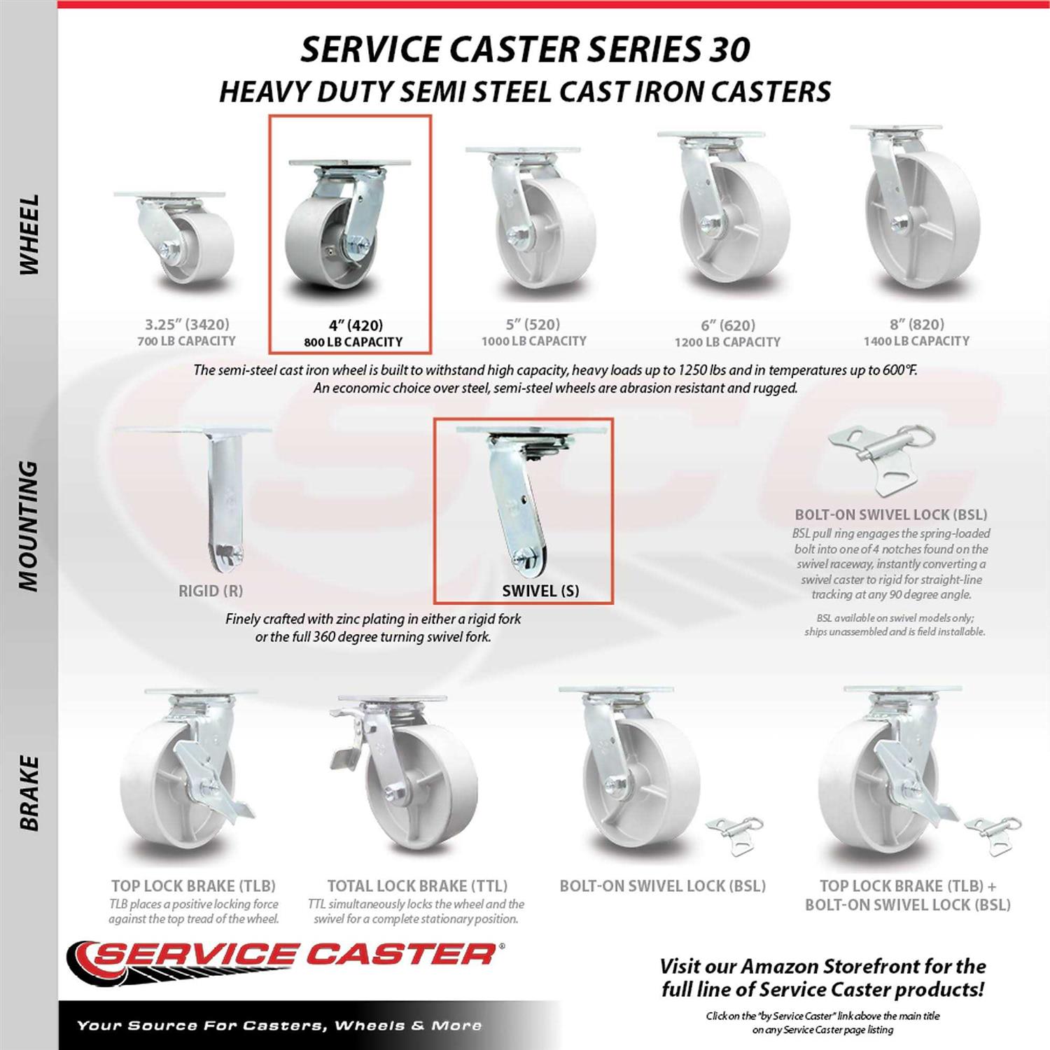 Listing is for one (1) Service Caster Series #30 swivel caster with a 4 inch diameter, 2 inch wide semi steel cast iron wheel. Supports 1000 pounds (lbs) per caster. When searching for a reliable and durable solution for heavy duty projects, consider Service Casters Series 30 top plate semi steel cast iron wheel casters. The semi-steel cast iron wheel is built to withstand high capacity, heavy loads up to 1250 lbs and in temperatures up to 600F. An economic choice over steel, semi-steel wheels are abrasion resistant and rugged. Finely crafted with a machined hub, wheel face and double ball bearing heat treated raceways, these versatile casters are ideal for a wide range of applications, such as dollies, platform trucks, warehouse carts and freight terminals. Or ensure a smooth and secure ride for industrial and commercial equipment.
