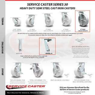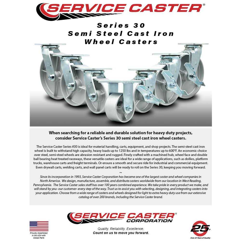 Listing is for one (1) Service Caster Series #30 swivel caster with a 8 inch diameter, 2 inch wide semi steel cast iron wheel. Supports 1250 pounds (lbs) per caster. When searching for a reliable and durable solution for heavy duty projects, consider Service Casters Series 30 top plate semi steel cast iron wheel casters. The semi-steel cast iron wheel is built to withstand high capacity, heavy loads up to 1250 lbs and in temperatures up to 600F. An economic choice over steel, semi-steel wheels are abrasion resistant and rugged. Finely crafted with a machined hub, wheel face and double ball bearing heat treated raceways, these versatile casters are ideal for a wide range of applications, such as dollies, platform trucks, warehouse carts and freight terminals. Or ensure a smooth and secure ride for industrial and commercial equipment.
