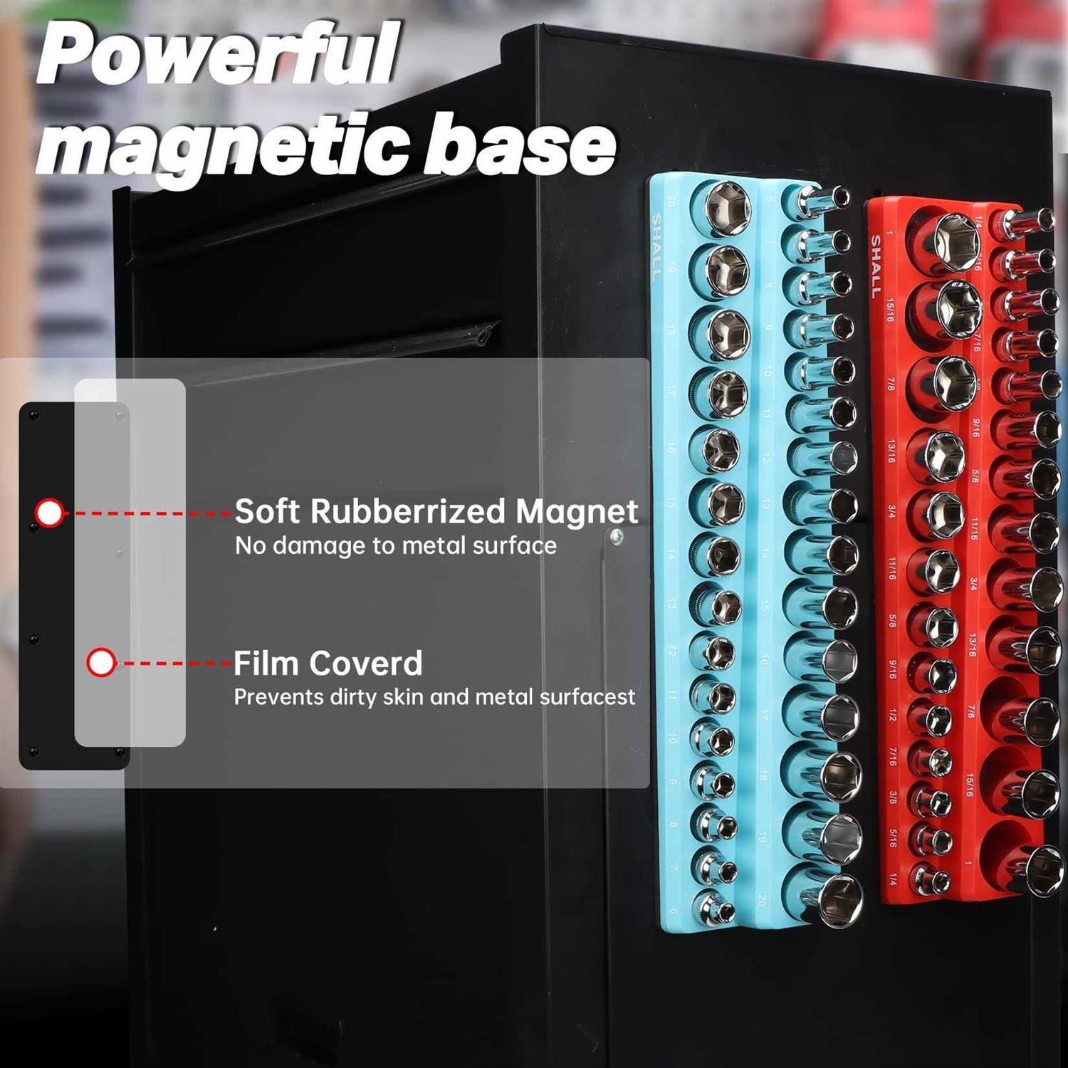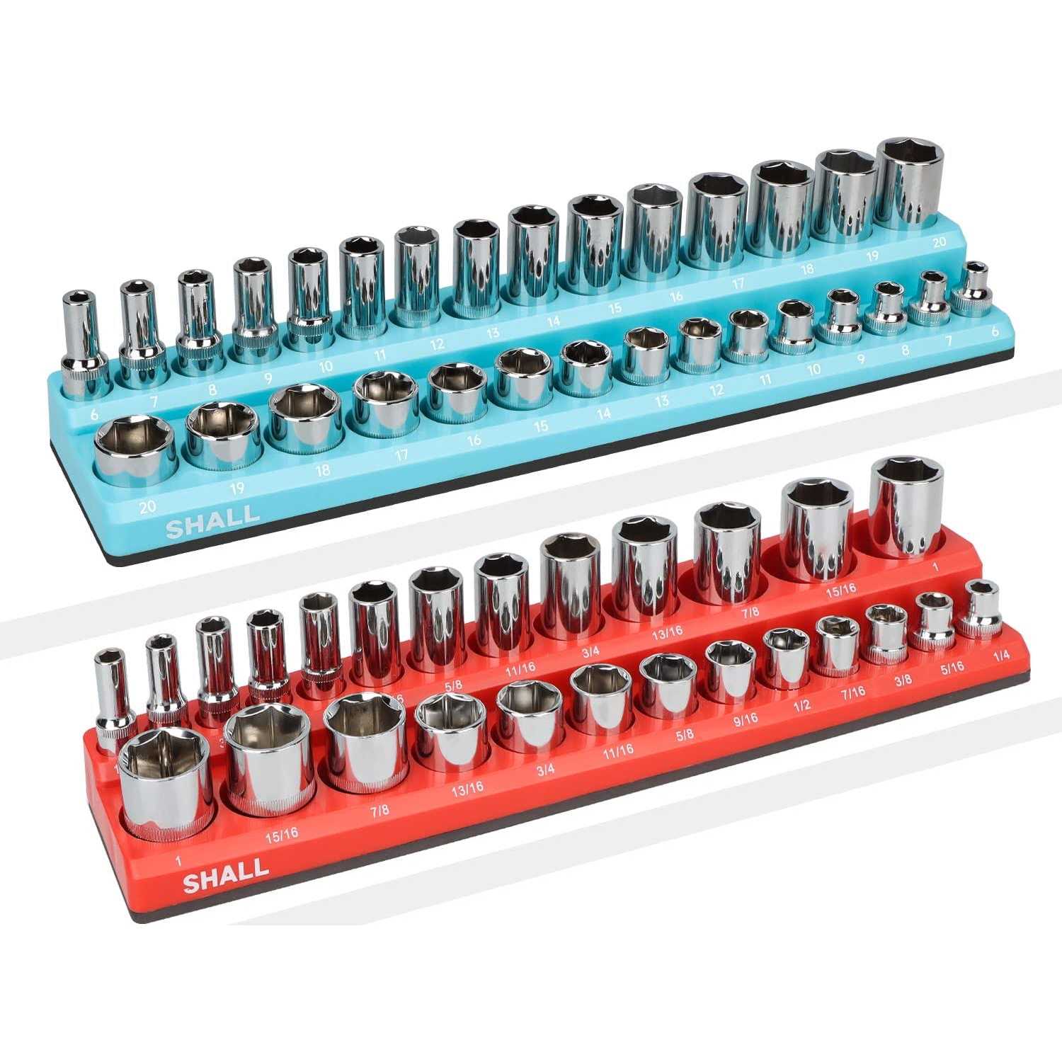 Shall 3/8 inch Magnetic Socket Organizer Set, 2-Piece SAE & Metric Socket Holders, Socket Tool Tray Storage Holds 56 Standard Sockets for Toolbox,