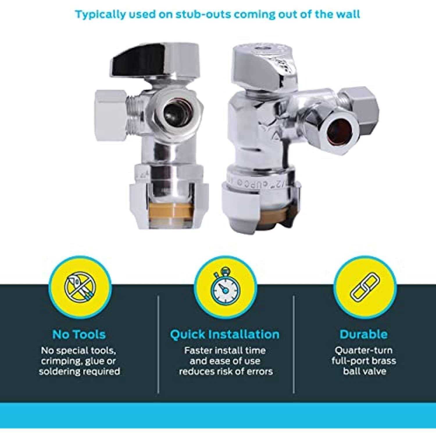 Controls water flow to household plumbing fixtures and allows 2 independent supply lines to be attached to one single stop valve. Typically used on stub-outs coming out of the wall. Used to control and shut Off water flow to the fixture for maintenance and repair. Innovative design with 1/2 in push-to-connect inlet and (2) 3/8 in compression outlets make for quick installation and quarter turn full port brass ball valve makes for easy operation. Ideal for working in tight spaces. Faster install time and ease of use reduces installation errors.