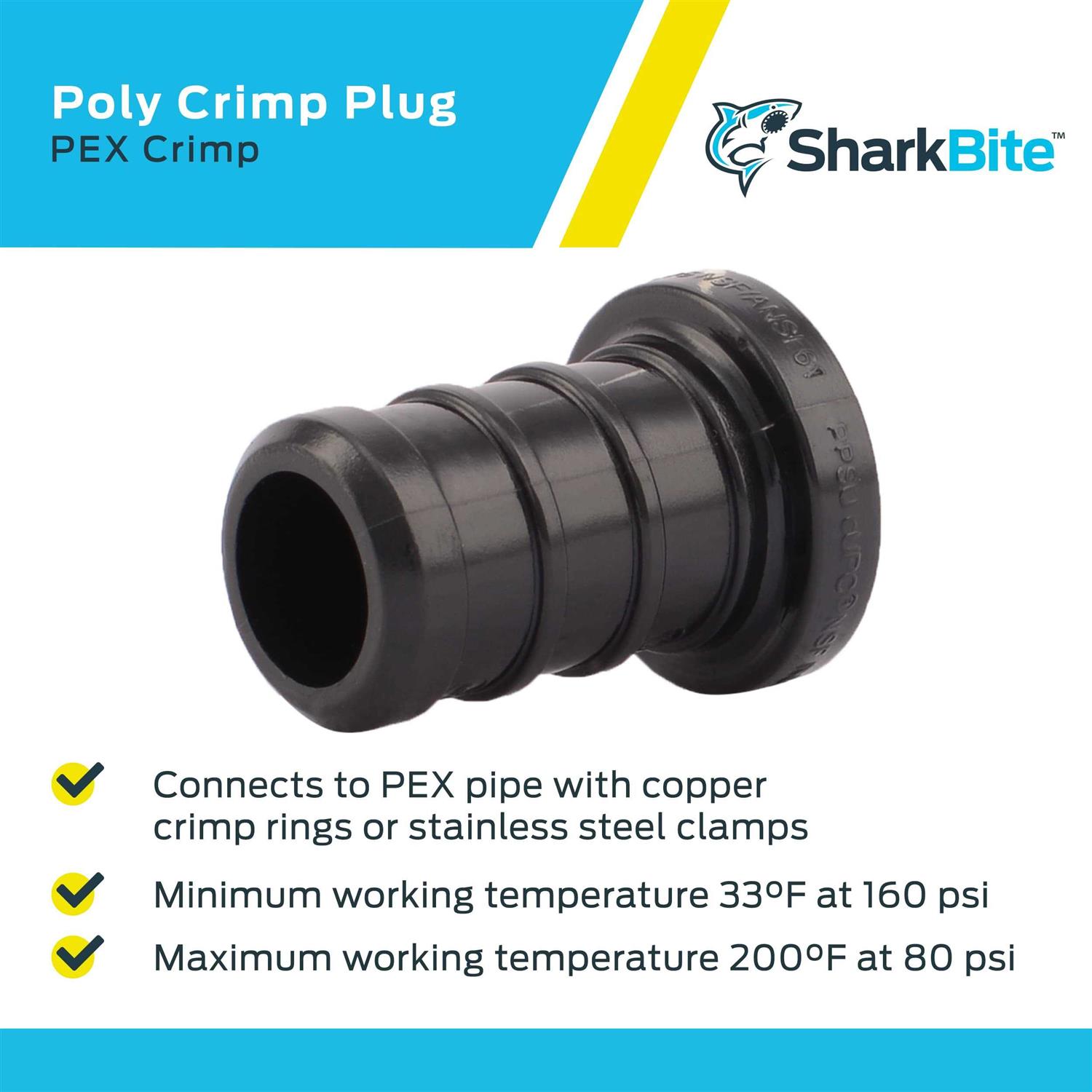Pipe Fittings by SharkBite. Details:Simplify your plumbing projects with the SharkBite poly crimp coupling plug. Composed of strong and sturdy Acudel Polymer, this straight PEX fitting is perfect for plugging the ends of PEX pipes using copper crimp rings or stainless steel clamps without the need for any additional tools, glue or soldering. This coupling connector plug is certified for use with potable, hydronic and radiant applications. Water service coupling plug features a minimum working temperature of 33 degrees F at 160 psi, and a maximum working temperature of 200 degrees F at 80 psi.