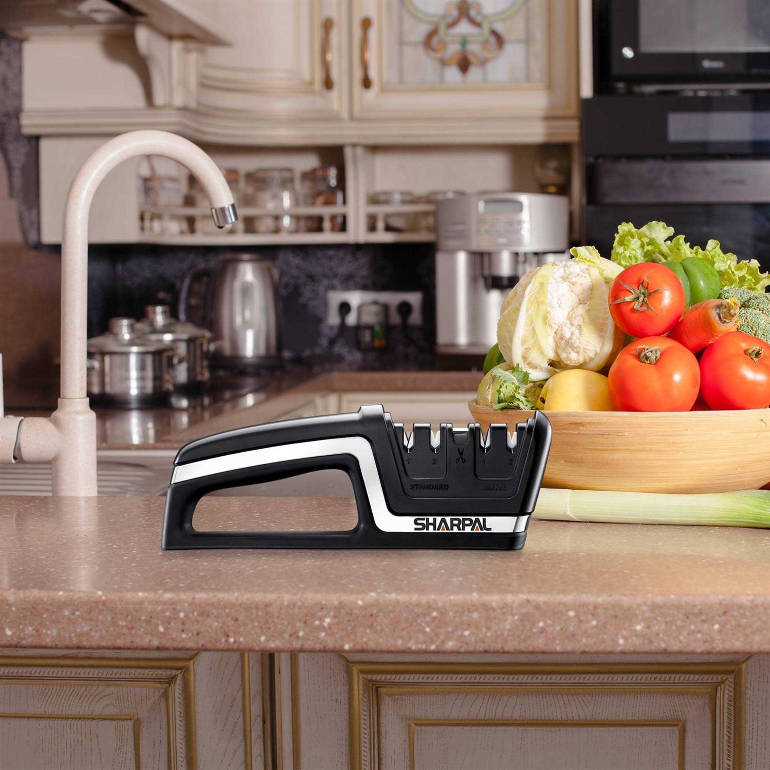 Sharpal This 5-In-1 Professional Knife and Scissors Sharpener is a perfect sharpener for those who own both standard European/American style knives & other Asian style knives of the double-beveled edge. Stage 1 uses two preset crossed carbide blades to put a quick edge on knives. Stage 2 uses ceramic blades to hone the fine edge. This sharpener can also be used for serrated blades. Only use stage 2 for serrations. The specially shaped tungsten carbide blade is designed for scissors sharpening. The heavy-duty, ergonomic handle with the rubber over-moulded grip provides a stable and comfortable platform for sharpening all your knives, scissors.