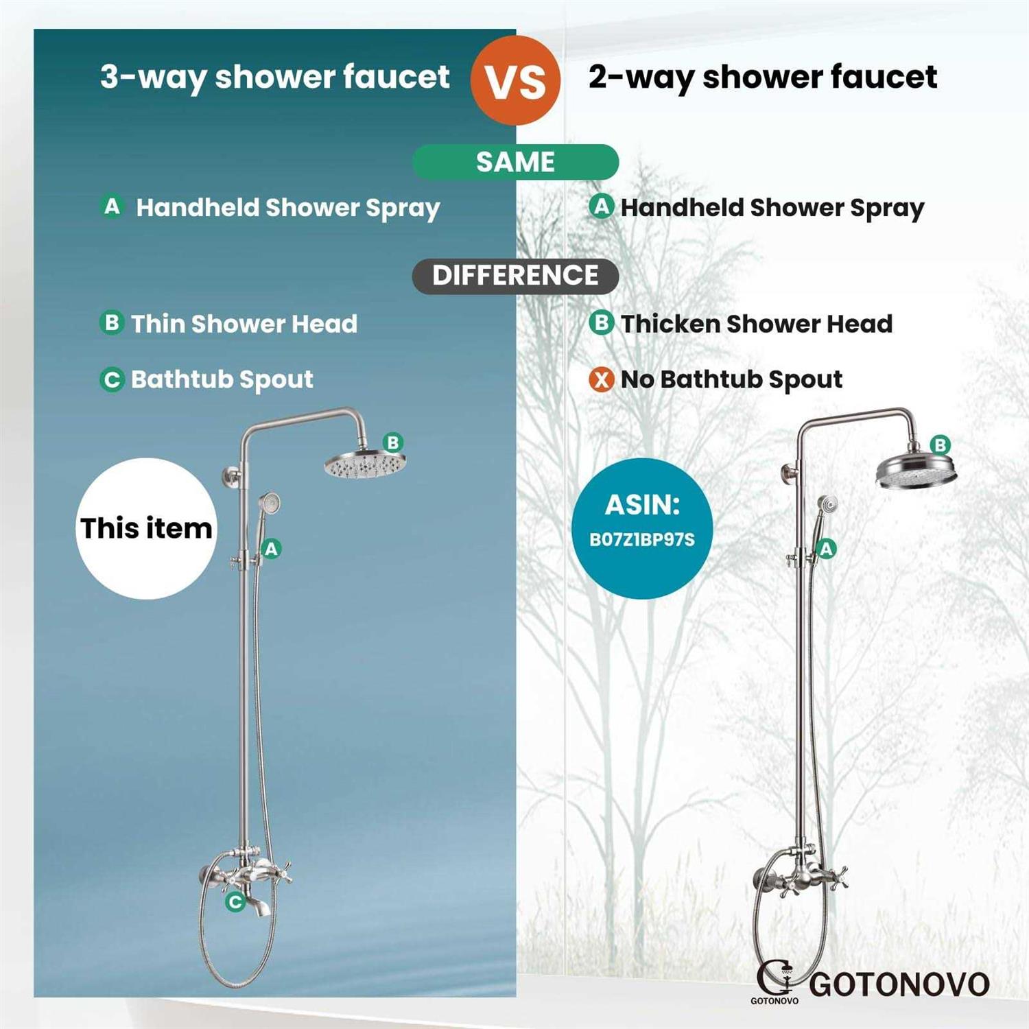 Durable Construction:Water use information:1.4gpm. 5.29L/min. – The wall mount bath tub shower set with 3-in-1 diverter shower mixer valve constructed from brass, prevent to be discolored,rusty – Features:3-Functional shower fixture,diverter switches between top shower,tub spout hand spray – Reliable Design:Shower height can be adjustable between 39 inch-55 inch (100 cm- 140cm).,59” Shower Hose,double knobs cross handle to control water and hot water – Very easy to Install:Surface mounted,easily retrofit your existing shower without a remodel. – Come with all the mounting hardware and installation instruction. – If want tub mount,need to buy the extra purchase :3-3/8″ adapter adjustable swing arms for tub mount – Adjustable Hole Distance:The hole center distance on the wall is 5.9 inch(15cm). Come with NPT 1/2 adapter to adjust installation hole distance between 5.1 inch to 6.4 inch(13cm-16.5cm).