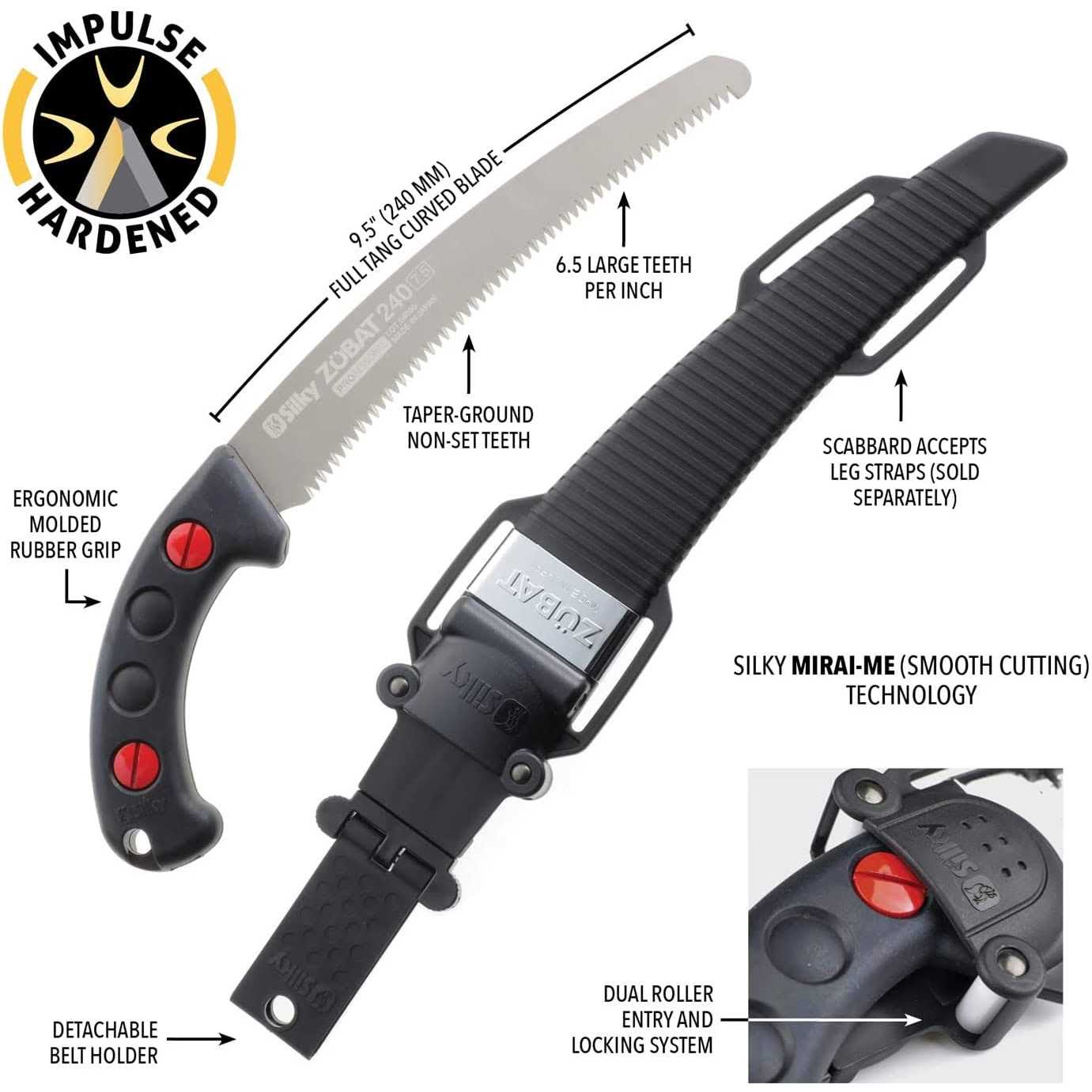 The saw that arborists and tree care professionals know and love now with Ultimate improvements! The ZUBAT Ultimate features a progressive teeth design that provides a smoother start to the cutting stroke while still maintaining efficiency with the aggressive curved blade. The scraper-shaped GOKAI-ME teeth are perfectly designed to remove remaining saw dust and to make both rip-cuts, cross-cuts and slant-cuts with ease. Progressive Teeth (6.5-7.5 teeth/30mm) give smoother start to the cutting stroke. Electroless Nickel Plating coats the entire blade giving it stronger rust resistance. The new heavy duty, durable and specially designed scabbard has a black metal plate and a lower profile look than the previous Zubat sheath. 3D Roller Lock System protects the scabbard from the teeth giving it a longer life with a pivoting sheath for the curved blade and a detachable belt holder. 330mm curved-blade saw with scabbard. 13-inch blade, 18.5-inch overall length, 1.1 lbs weight, 1.4mm kerf. Product Applications include Arborist, pruning, trimming and forestry.