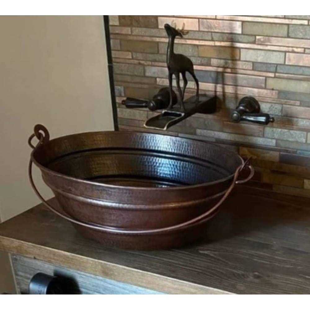 SimplyCopper Welcome to SimplyCopper discover the old-world beauty of SimplyCopper’s handmade copper sinks. Easy to care for, each sink is one of a kind. This oval bucket designs a beautiful hand-forged sink to provide a rustic antiqued look. This copper sink is installed as a vessel.