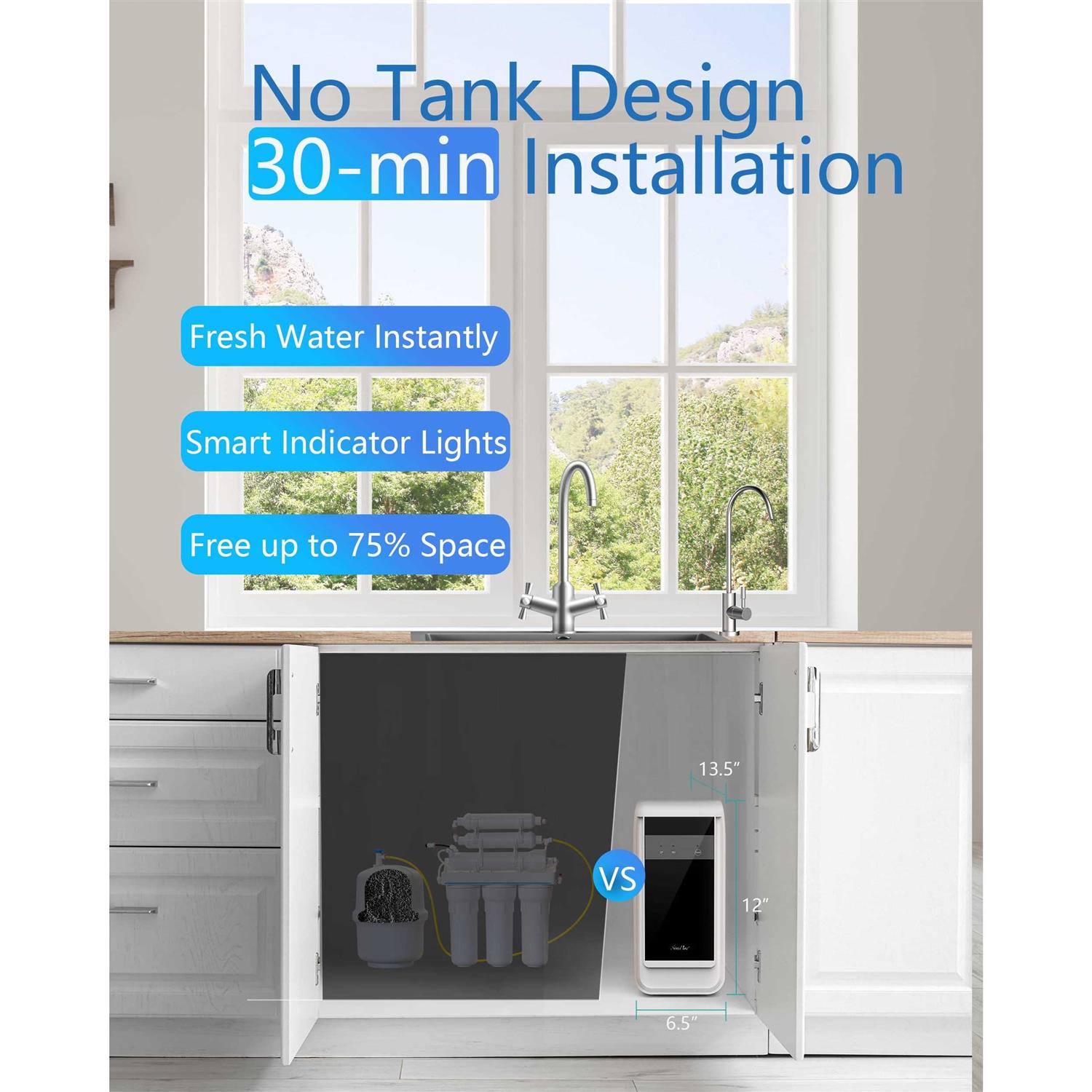 Effective Filtration Performance: Adopting composite CF Filter and RO membrane with the highest filtration precision at 0.0001 microns, SimPure Q6 under sink reverse osmosis water filter system gets rid of 99.99% of harmful contaminants from water including Chlorine, Arsenic, Lead, heavy metals, sediment, rust, algae, TDS and more. You can count on this tankless RO system to produce delicious, reliably purified water for you and your whole family. Tankless Design: Different from traditional RO systems, Simpure Q6 under-sink reverse osmosis system has a compact design without a bulky tank. It frees up to 75% of space, making your cabinet neat and clean. In addition, you don’t need to worry about secondary pollution due to the unventilated tank anymore! 600 GPD Fast Water Flow: The tankless reverse osmosis water filtration system produces 600 gallons of filtered water per day. With a fast and stable water flow rate, it quickly fills a 7oz cup of water in 6 seconds. With a 2:1 pure-to-drain ratio, this RO water filtration system saves up to 1000% of water when compared to conventional ones(1:4), which is really eco-friendly. Long Service Life: The CF filter lasts up to 6-12 months while the RO filter lasts 12-18 months (depending on local water quality). The filter life indicators will remind you to replace the filter when its time to change. Only $0.2/day, it allows you to drink pure water and enjoy your healthy life at a reasonable price! Easy to Install & Replace: No plumber required! With the help of a step-to-step user manual and tutorial video, you can completely install this Q6 water purification system in 30 minutes. Due to the filters quick-changing twist design, you can replace a filter in 3 seconds for hassle-free operation.