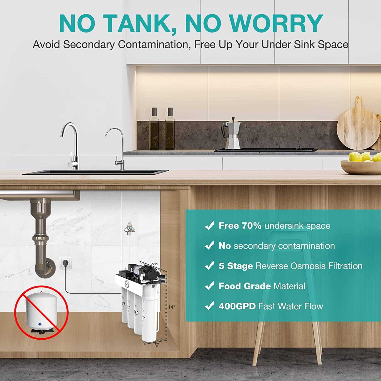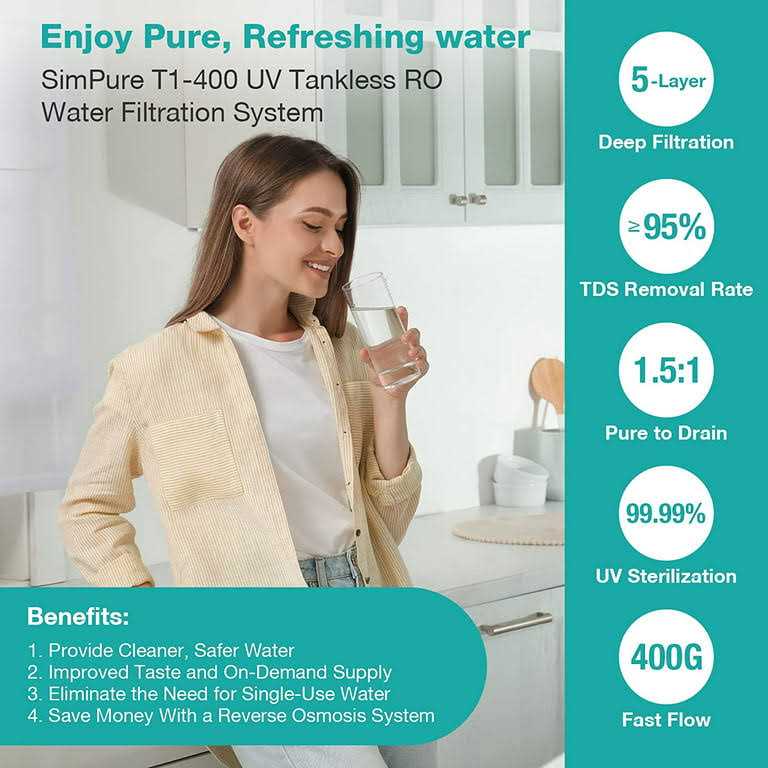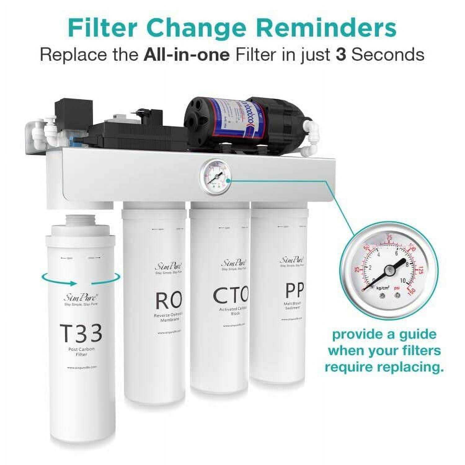 SimPure T1-400 UV under sink water filter system uses 5-stages of filtration and UV, purification to remove turning tap water or well water(TDS600ppm) into pure drinking water up to 99.99% of Chloride, Chemicals, PFAS, TDS, Arsenic Salt, Lead, Fluoride, Heavy Metals, Pharmaceuticals, Microplastics, Viruses, Bacteria, and 1000s of other contaminants. – T1-400 reverse osmosis water filter system can reduce tap water with TDS less than 200PPM to 0ppm and tap water with TDS less than 600ppm to 30ppm or less. – Compared to typical RO systems,T1-400 is designed with innovative tankless can supply pure water on demand and no waiting. – It is easy to install either under the sink or on the wall, and the clear user manual and video guide can help you complete the installation in 30 minutes. – This T1-400 RO water filter system can effectively isolate the PFAS pollution problem. – It’s equipped with boost pump offers faster water flow (400 gallons per day) and low drain ratio of 1.5:1. If you need to replace a part, please click! NOTE: Please fully turn on the faucet and flush the RO system for 20 minutes after installation.